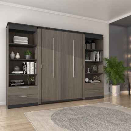Bestar Orion 104W Queen Murphy Bed and Narrow Storage Solutions with Drawers (105W) in Bark Gray & Graphite