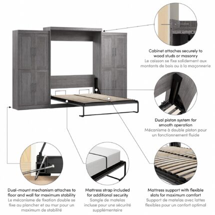 Bestar Pur Queen Murphy Bed with Closet Storage Organizers (136W) in Platinum Gray
