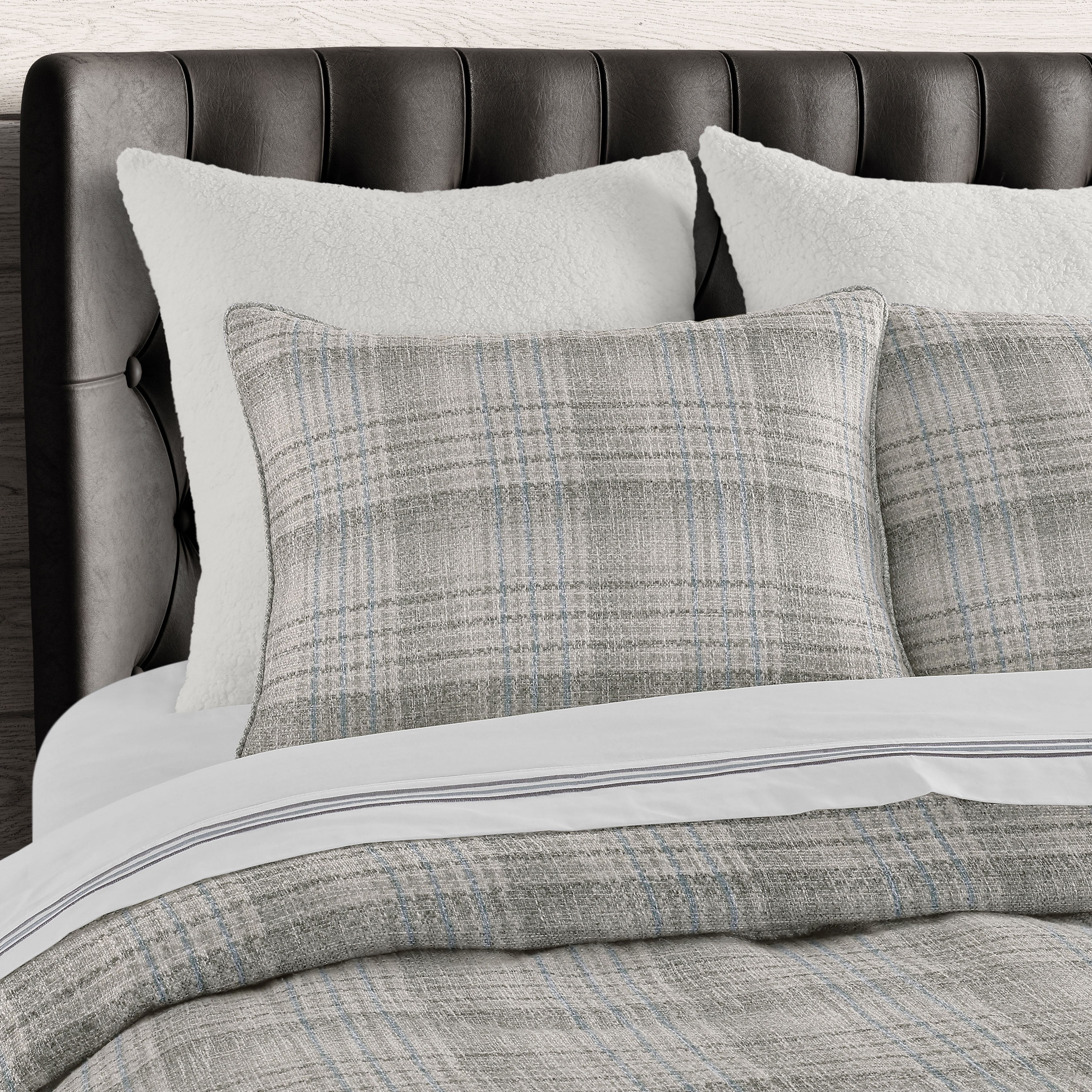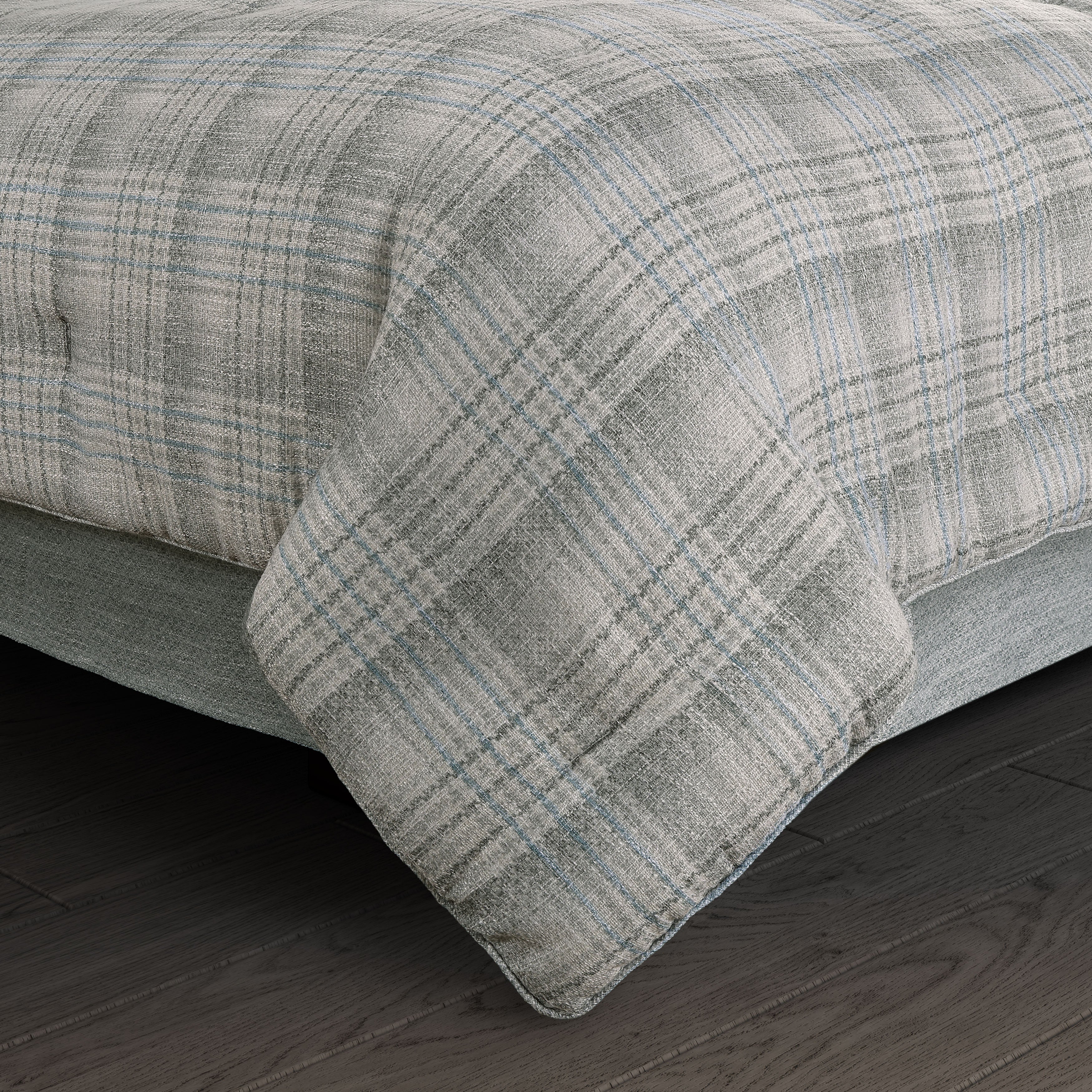 The alejandro comforter set offers a cozy contemporary ensemble that works all-year-round. Featuring a woven plaid pattern in soft spa and cream colors, with a plush microfiber reverse for a soft hand-feel. The included pillow shams and textured bed skirt coordinate perfectly the comforter, and both are tailored along the trim for a fine finish. Complete the alejandro collection with the luxurious throw pillows, euro shams, and window treatments (sold separately).