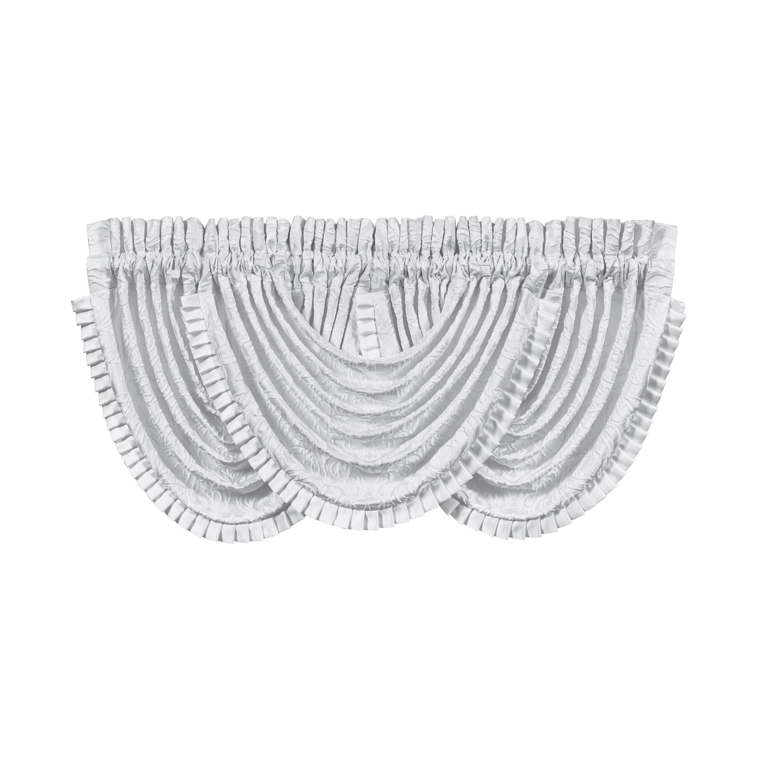 Traditional meets modern in the Astoria waterfall valance . A white ground sets the stage for large scale damask embellishments in gold that create a unique three dimensional effect.