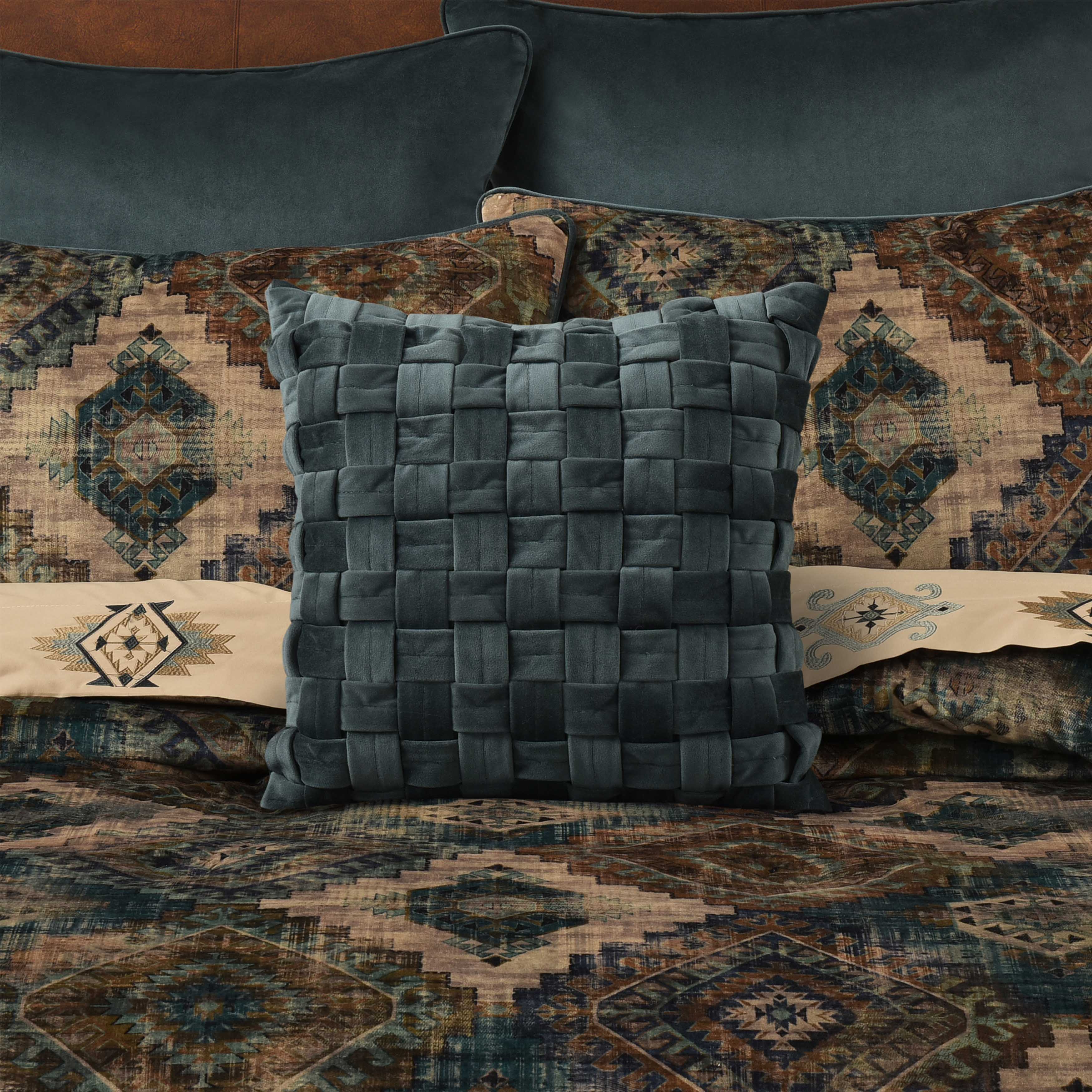 Transform your living space with the bold southwest design of the baja throw pillow. Made with a soft forest green velvet fabric and constructed with a unique basket weave technique, this accent pillow will add a perfect blend of warmth and rustic elegance. Pair this pillow with the baja window treatments and bedding ensemble to complete the look.