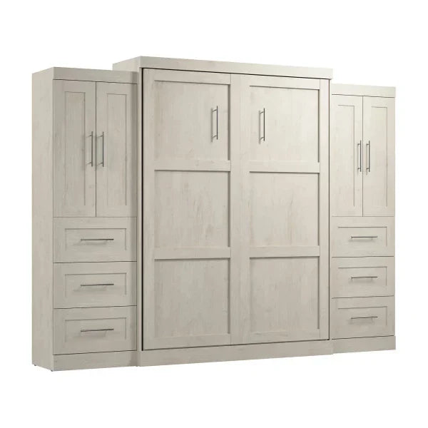 Bestar Pur Queen Murphy Bed with Closet Storage Cabinets (115W) in Linen White Oak