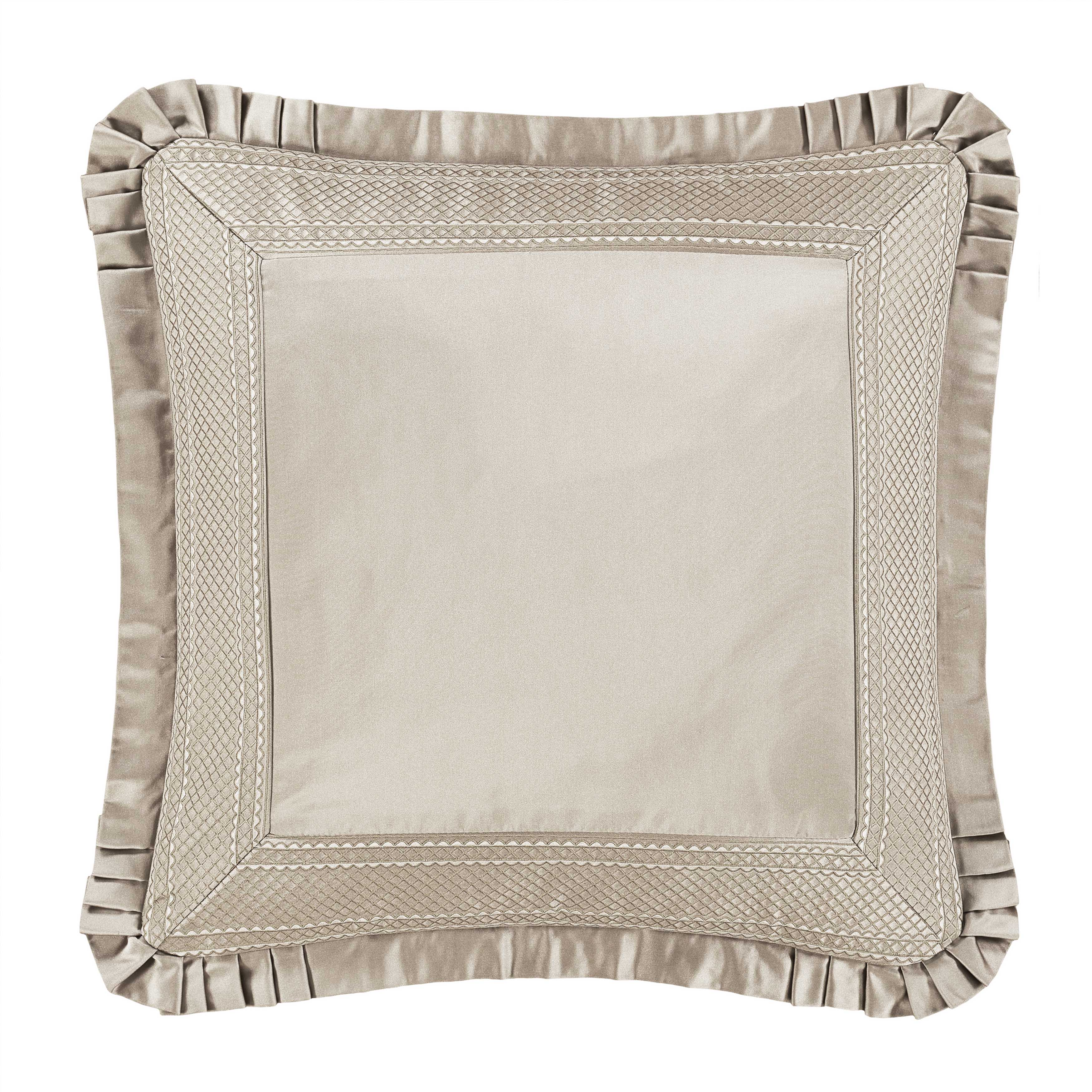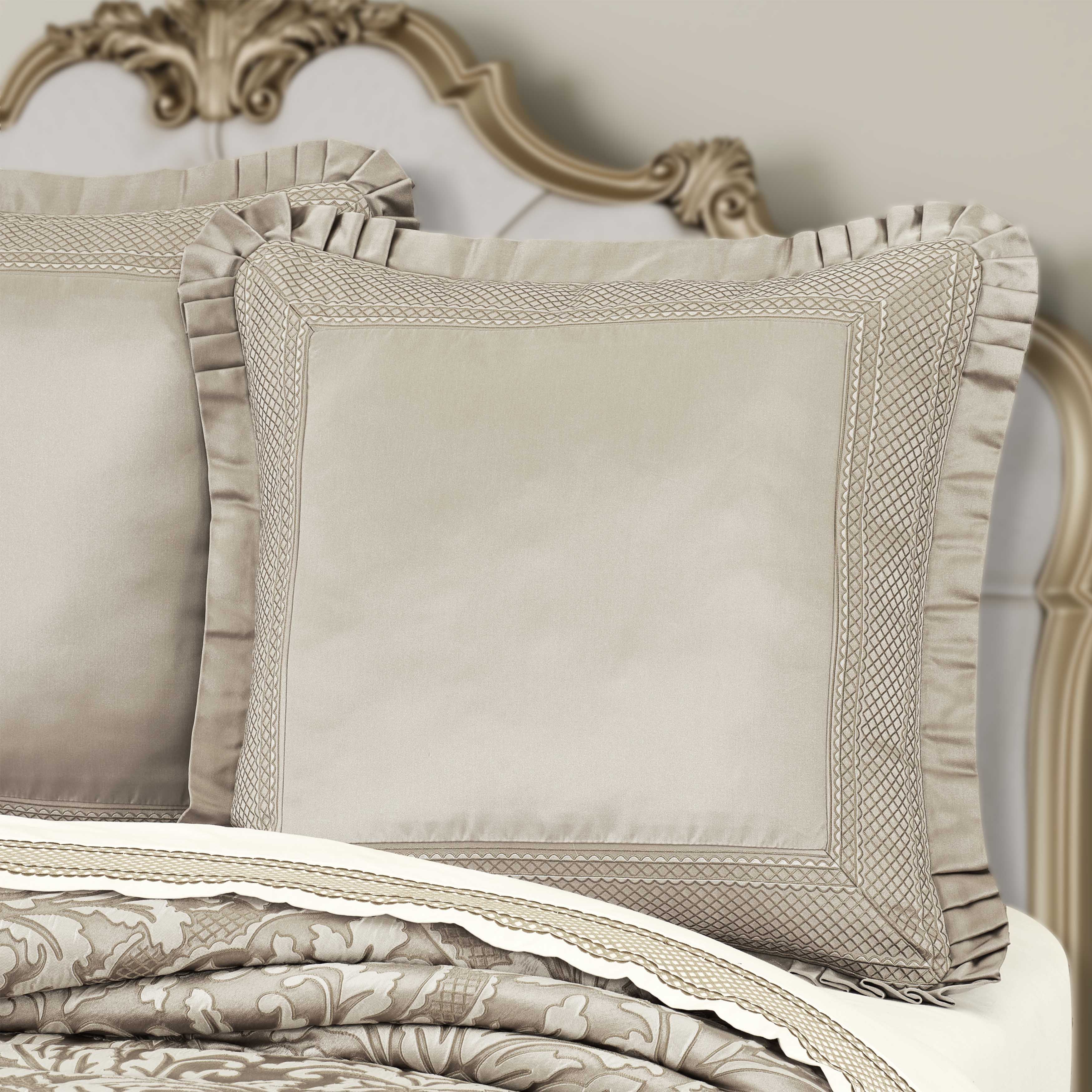 Classic elegance on a grand scale, the brunello euro sham is tailored with a smooth satin center and bordered with an intricate jacquard band in gorgeous cream and shimmering flax tones. The surrounding edge is adorned with a satin pleated flange and reverses to a smooth solid fabric with a hidden zipper closure. Brunello designs are perfect for formal bedrooms, dining rooms, or anywhere that calls for a sophisticated, timeless look and it directly coordinates with the window and bedding set (sold separately).
