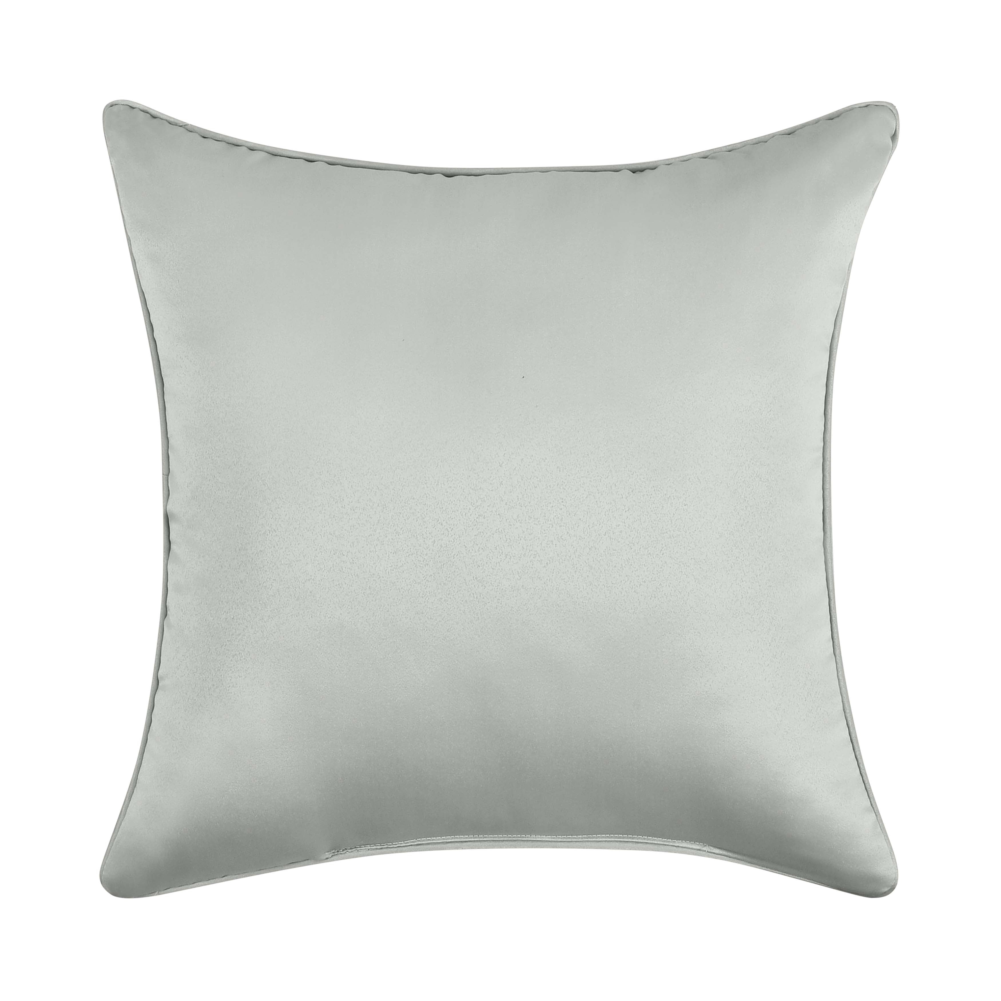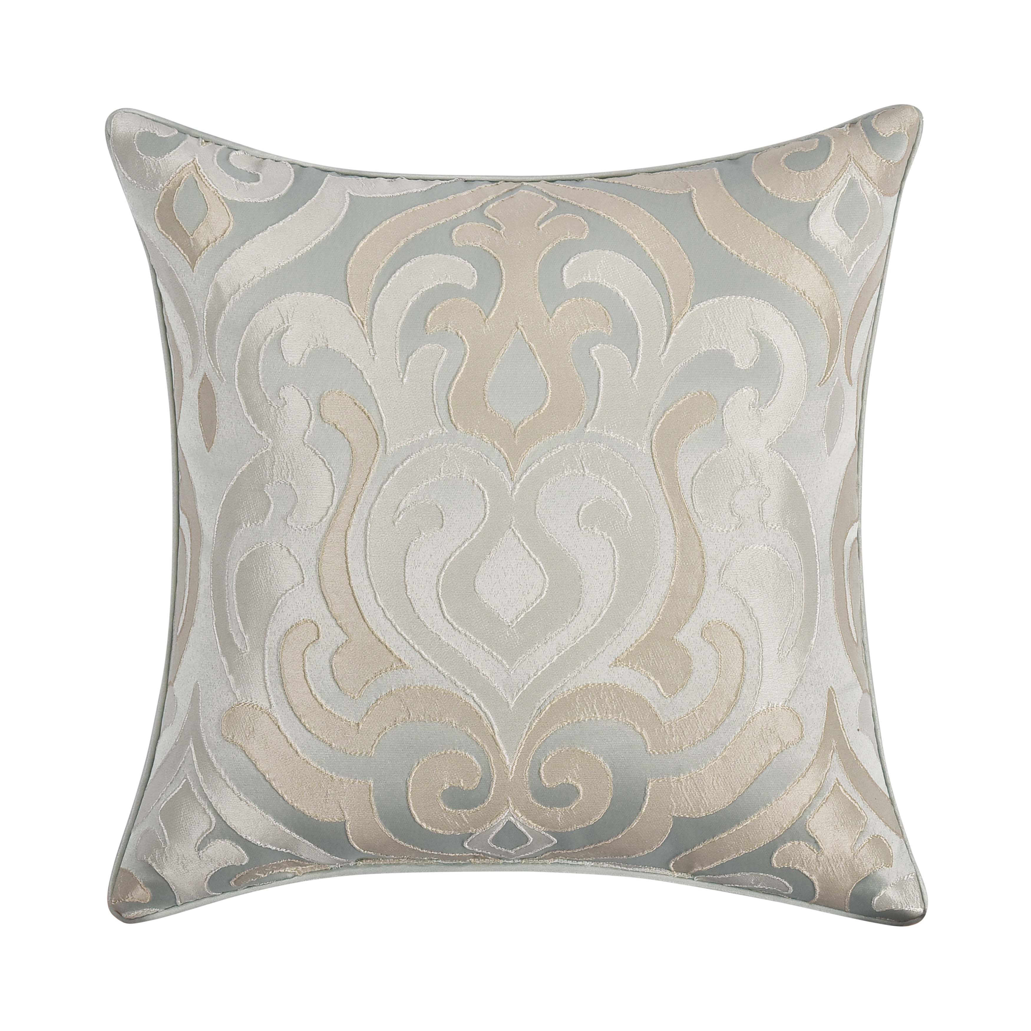 The calmfield 18 inch throw pillow is intricately designed with a woven jacquard in shades of aqua, cream, and ivory. The pillow reverses to a coordinating aqua fabric and is finished with self-fabric piping. Add the calmfield comforter set and window collection to complete the look.