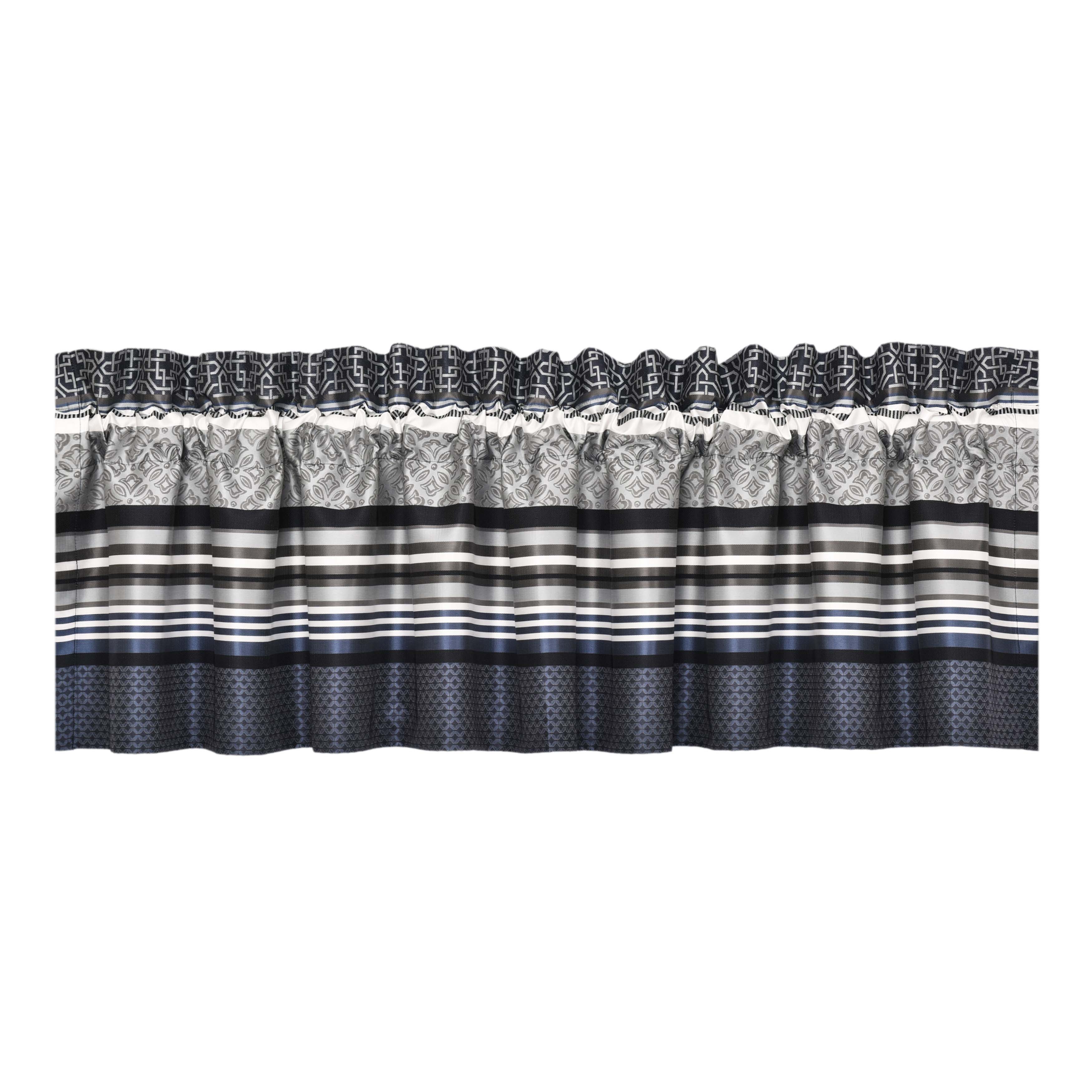 The carlisle window valance feature a sophisticated woven geometric stripe pattern in silver and indigo blue colors. Fully lined to provide darkness for comfortable sleep and relaxation. The valance is engineered and finished with a tailored hem and is designed to coordinate with the carlisle window panels to complete your bedroom windows.