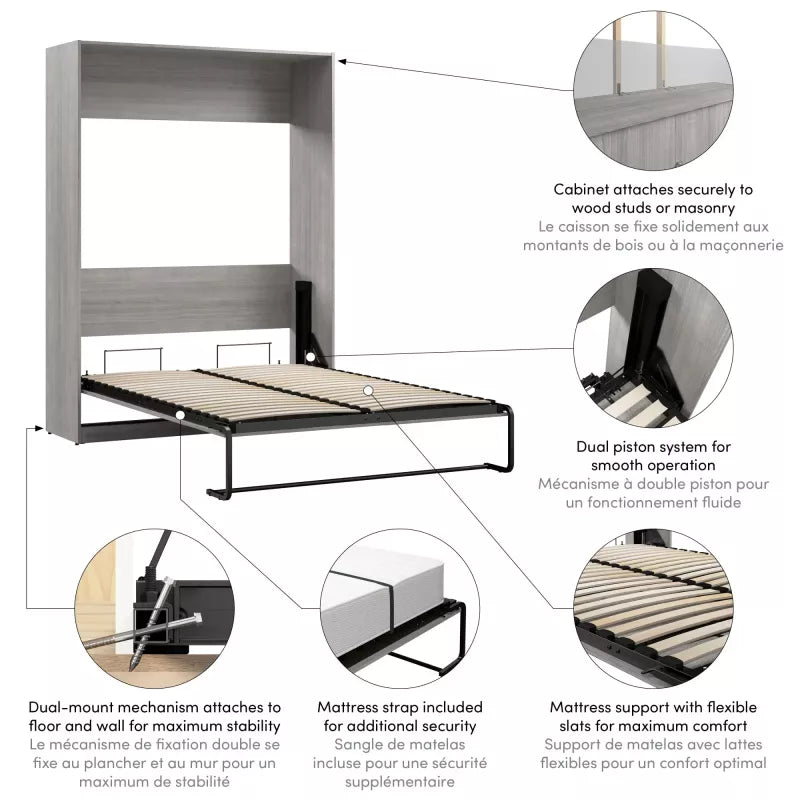 - Dual-mount wall bed mechanism attaches to floor and wall for ease of assembly and maximum stability and durability