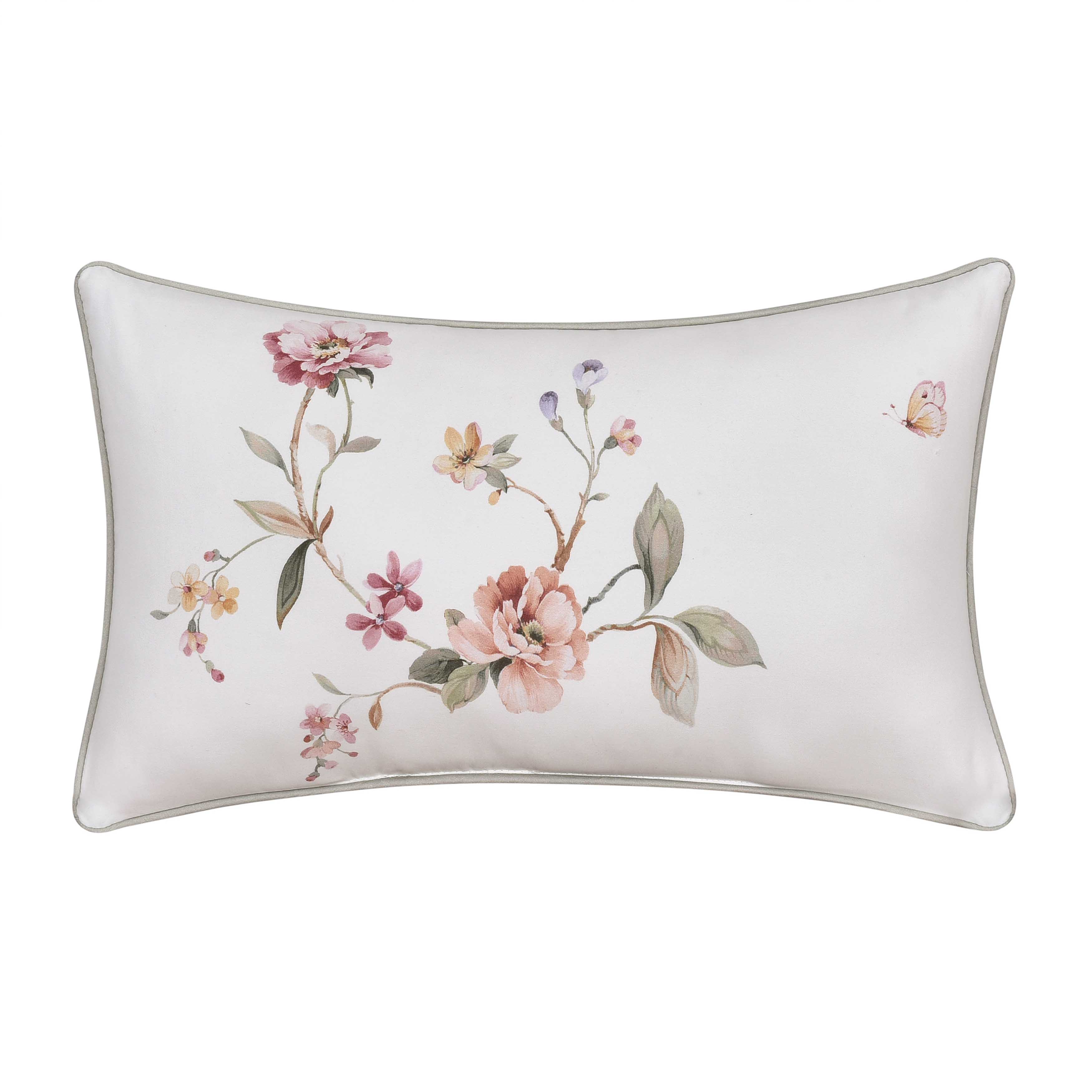 The clarice boudoir throw pillow evokes a sense of classic sophistication, creating an inviting atmosphere. It features a cream background adorned with a delicate floral & butterfly pattern in shades of soft pink, coral, violet and gold on a natural cotton fabric. Add the clarice window treatments and bed set to complete the charming cottage look.