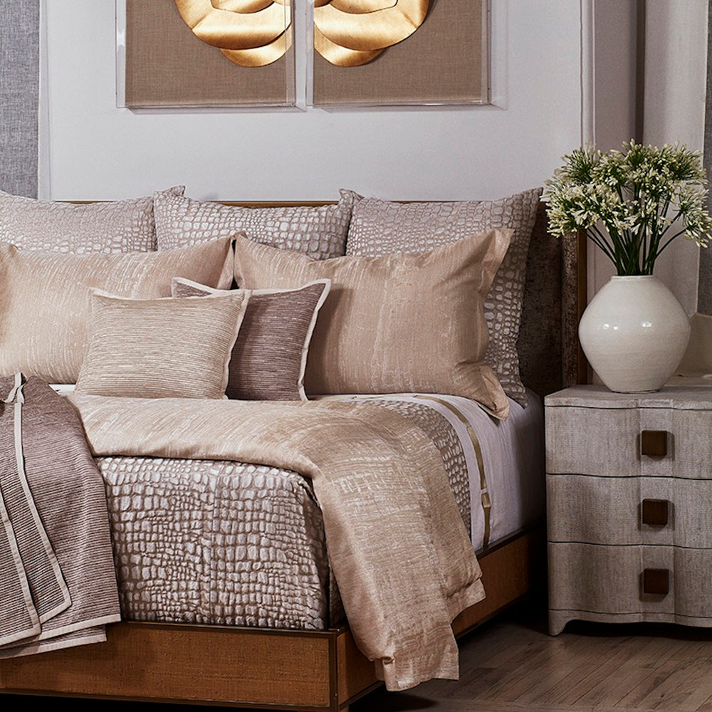 The Art of Home by Ann Gish was created to provide customers with the same quality of goods curated by Ann Gish, at an attainable price point. The products from this collection are sure to elevate any space. Our designs rely on elegance that is easy and pleasurable to live with, achieved through a marriage of form and function. It is luxury created for and enjoyed by the senses. Inspired by luxurious leather handbags. This dimensional jacquard is beautiful and bold, despite coordinating with a variety of bedding collections.