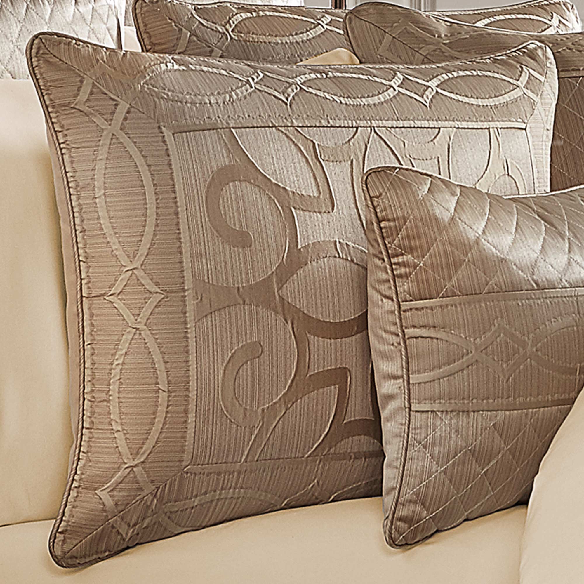 The Decade 4 Piece Comforter Set Collection Features A Highly Constructed Sleek Engineered Jacquard With Bordered Edges. This Alluring Modern Geometric Motif Is Constructed With A Puff Technique Which Sits On A Lustrous Stria Satin Ground In Elgant Gold Tones. This Comforter Is Generously Oversized And Overfilled For A Sophisticated Look. The Matching Hidden Zipper Closure Pillow Shams Are Engineered With A Sleek Border Showcasing The Geometric Motif. The Bedskirt Has Extra Length And Is Constructed With A Split Corner Tailored Finish And The Coordinating Stria Satin Is Bordered With A Geometric Puff Jacquard Finish. Coordinate Decade Accent Pillows, Shams, And Window Treatments By J. Queen New York Are Available Separately.