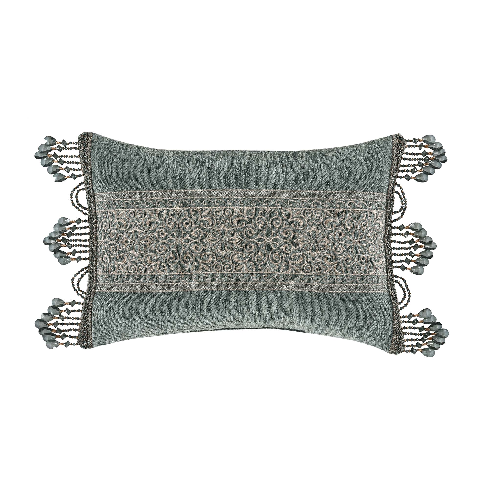 The Dorset Boudoir Pillow Features A Solid Spa Blue Chenille With A Detailed Scroll Metallic Embroidery And Top Stitched With A Dyed To Match Crystal Tassel Fringe On Outer Edges. Pair This Pillow With The Dorset Bedding Set By For A Complete Luxe Look.