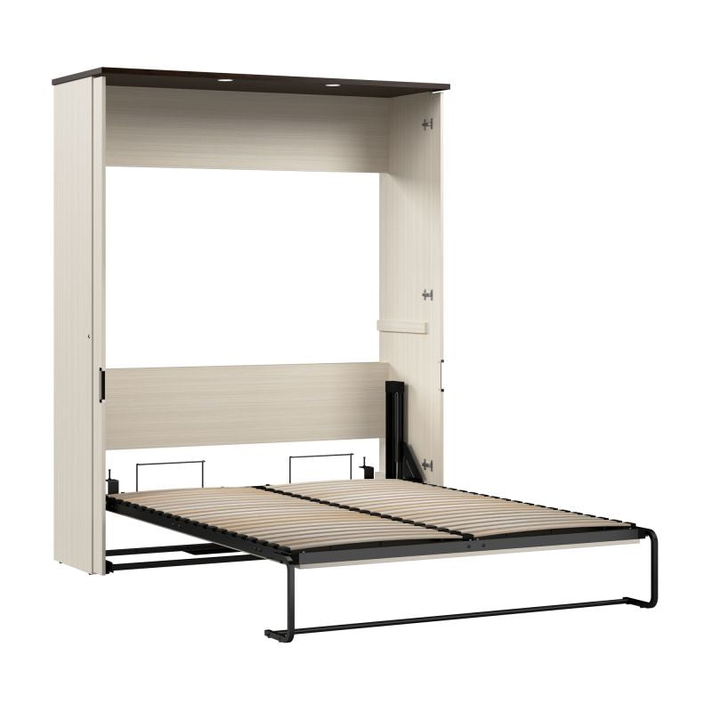 A dual piston system folds the full size Murphy bed down quickly and smoothly. The flip-up work surface provides a laptop desk for handling small projects and daily tasks. The mattress support features flexible slats that follow the curves of the body and absorb pressure for maximum comfort.