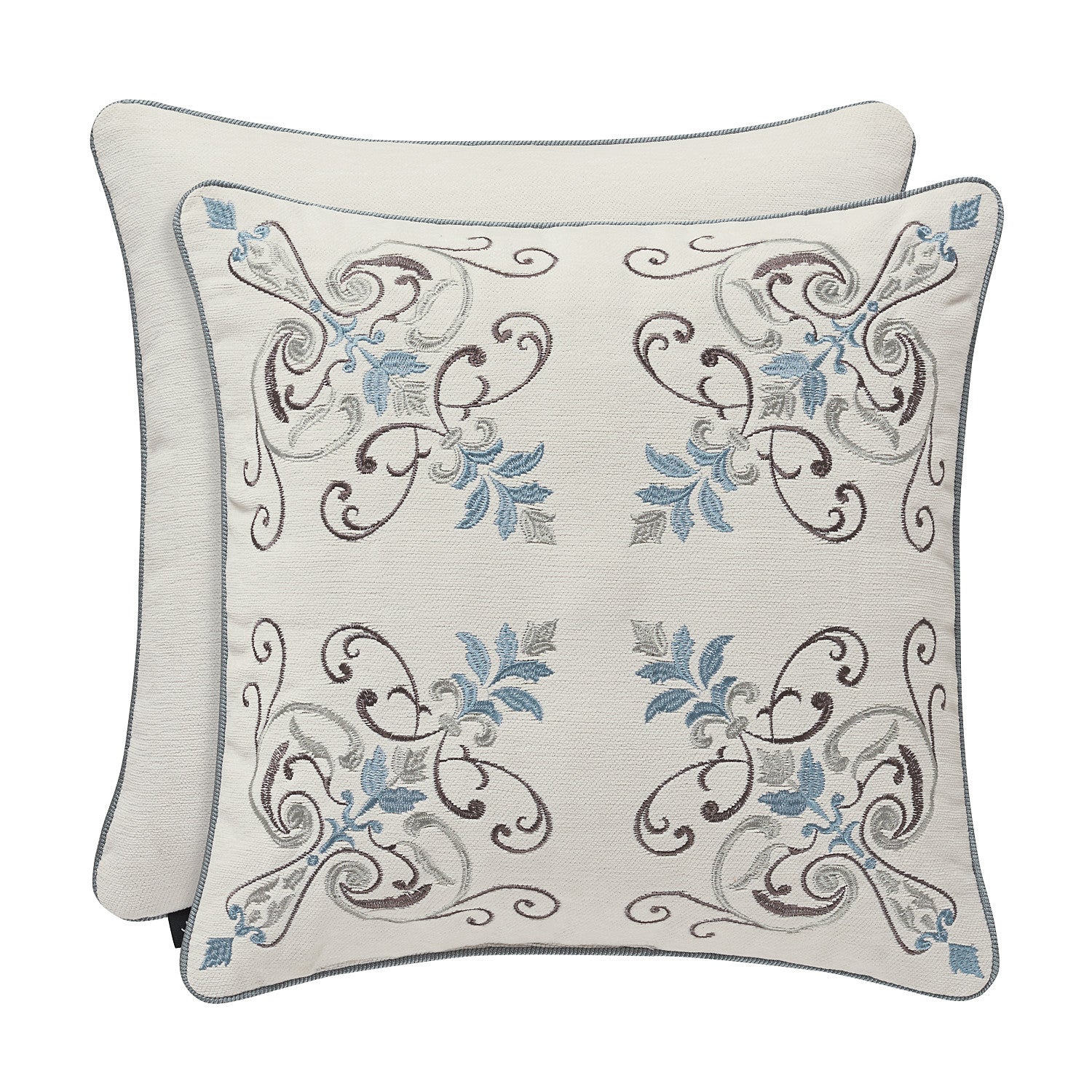 The 18 inch embellished throw pillow features a delicate embroidered design in spa blue tones on a solid white chenille face.