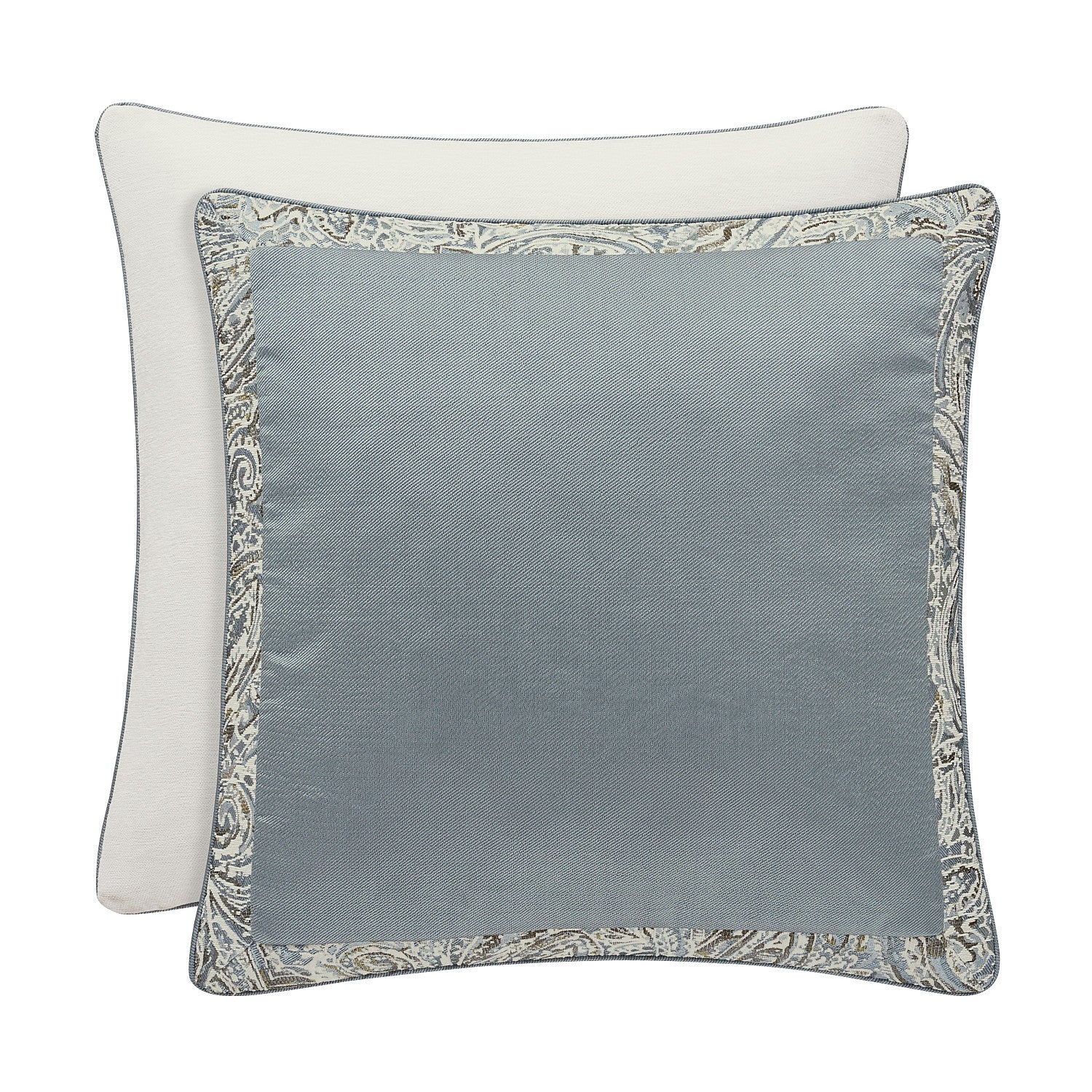 The Giovani Euro sham has a mitered designed formed from an engineered paisley border in spa blue tones. The sham reverses to solid white chenille.