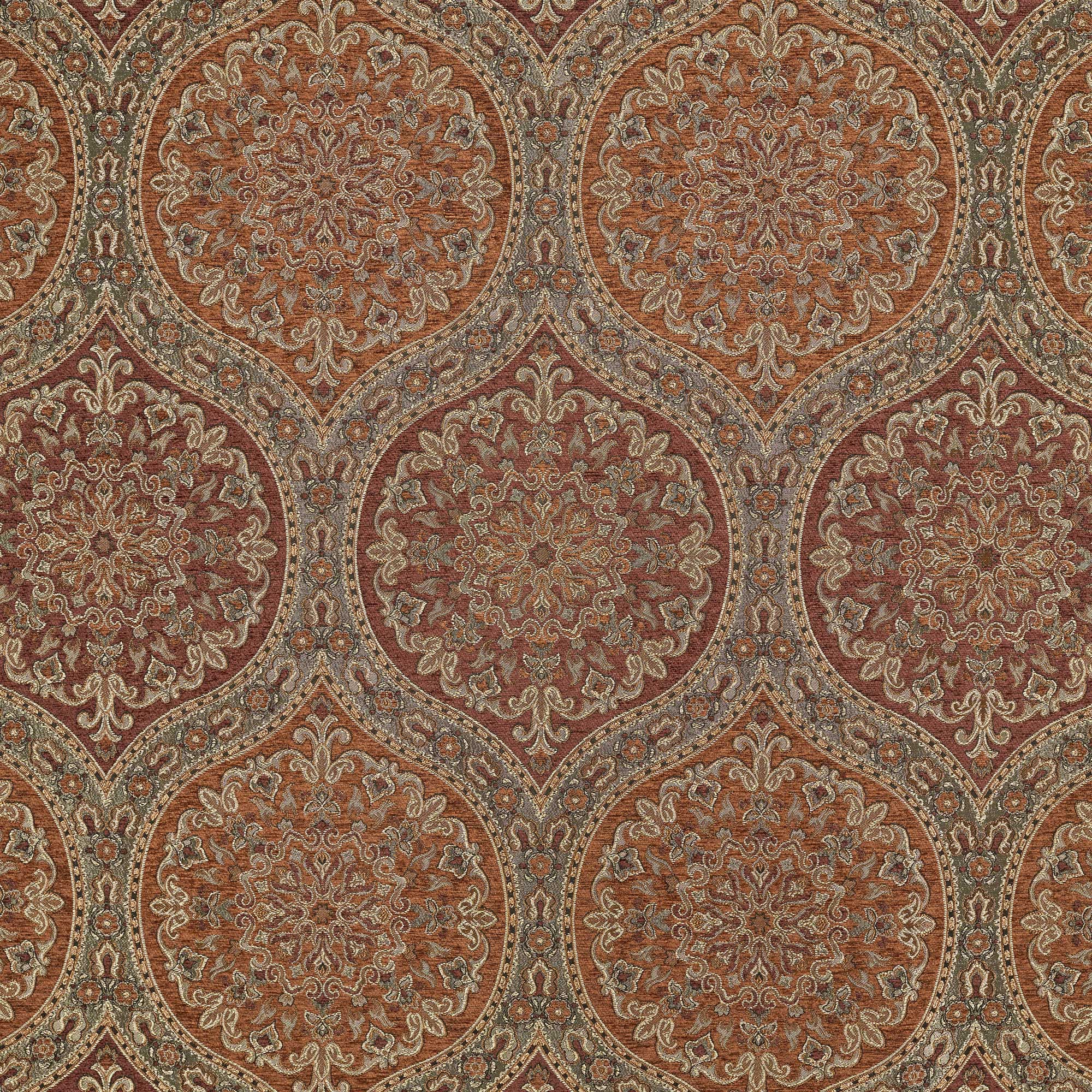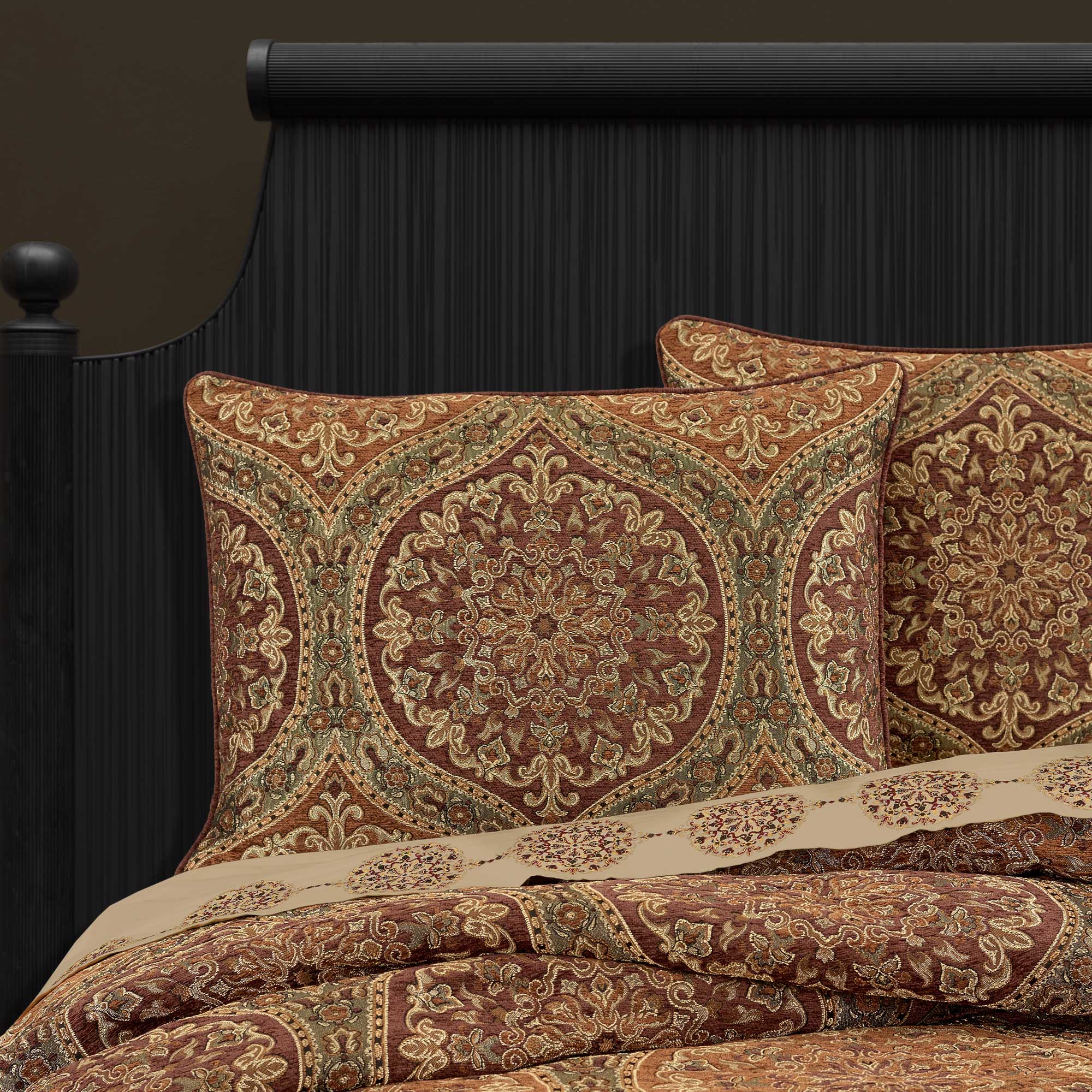 The Harvest Moon 4 Piece Comforter Set Bedding Collection Is Exquisite With Its Fine Details And Sophisticated Use Of Terracotta, Burgundy, And Gold Colors. This Beautiful Woven Jacquard Medallion Ensemble Is Rich With Design House Quality Fabric And A Soft Chenille Finish. Paired With Matching Hidden Zipper Closure Shams And A Solid Chenille Split-Corner Bed Skirt, This Oversized Ensemble Will Add Timeless Style To Your Bedroom Decor. The Reverse Of This Set Features A Plush Solid Microfiber Dyed To Match The Black Base Of The Front Pattern And Is Finished With A 1/4″ Chenille Piping. Pair This Collection With The Harvest Moon Throw Pillows And Window Treatments By J. Queen New York To Complete The Look.