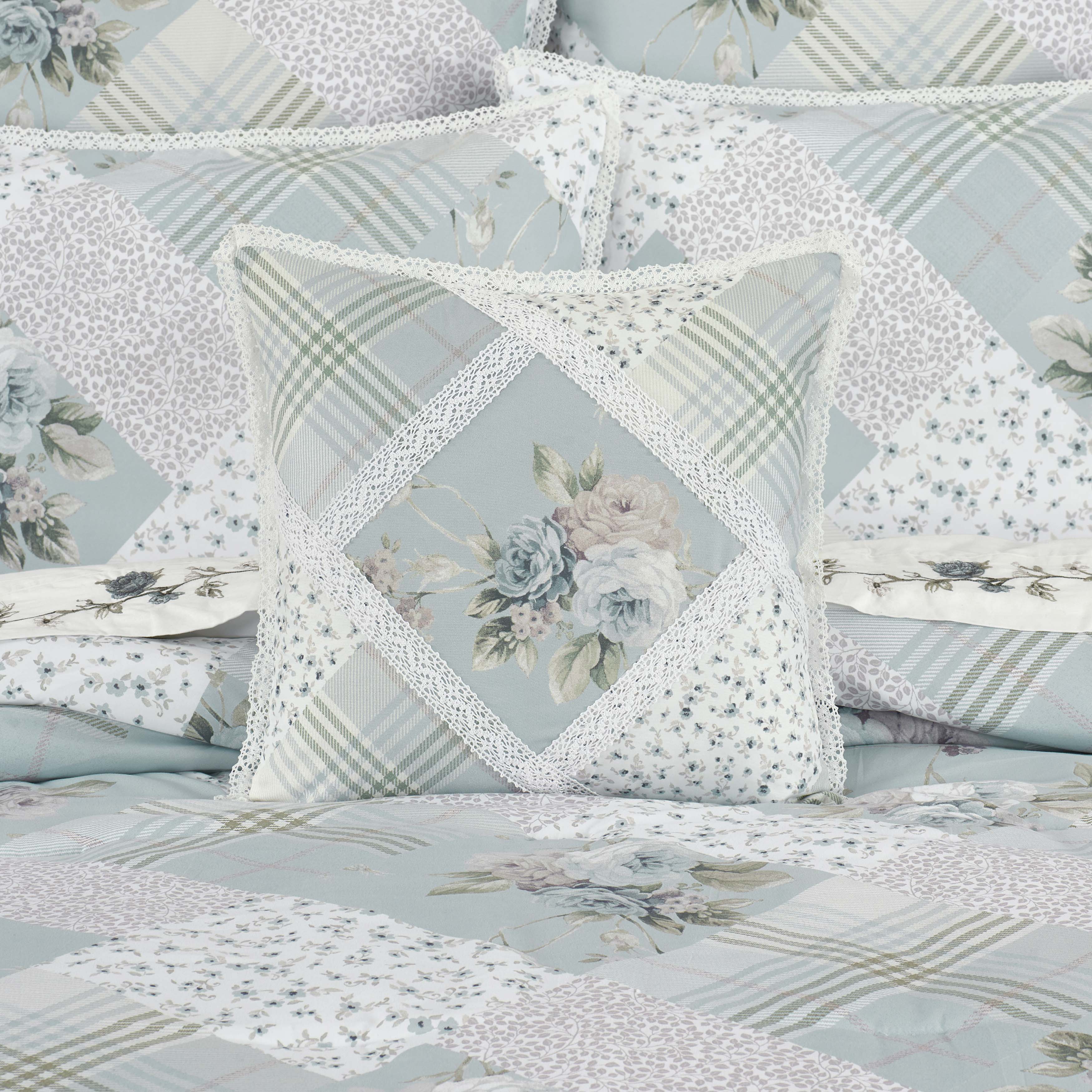 The Huda 16″ square decorative pillow features a classic patchwork floral design, creating an atmosphere of vintage charm and elegance. The patchwork printed floral is surrounded by a delicate cotton lace and is piped with a matching spa blue color solid. This coordinate pillow gives an added charm and layering to the lovely Huda bedding collection.