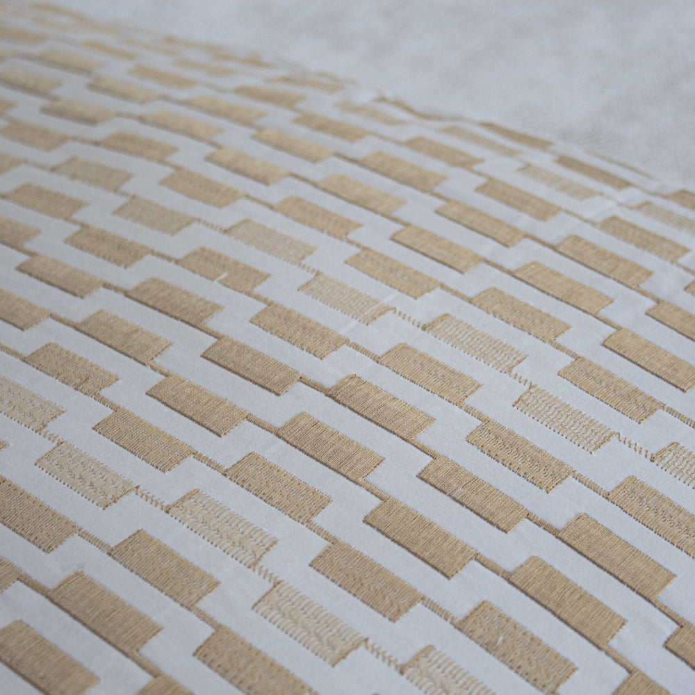The Art of Home by Ann Gish was created to provide customers with the same quality of goods curated by Ann Gish, at an attainable price point. The products from this collection are sure to elevate any space. Our designs rely on elegance that is easy and pleasurable to live with, achieved through a marriage of form and function. It is luxury created for and enjoyed by the senses. This graceful pattern of greens, ambers, and tans is digitally printed onto a linen blend. Tiny rectangles of embroidery dance across this 100% cotton fabric. Available in palladium and gold, two very precious metals.