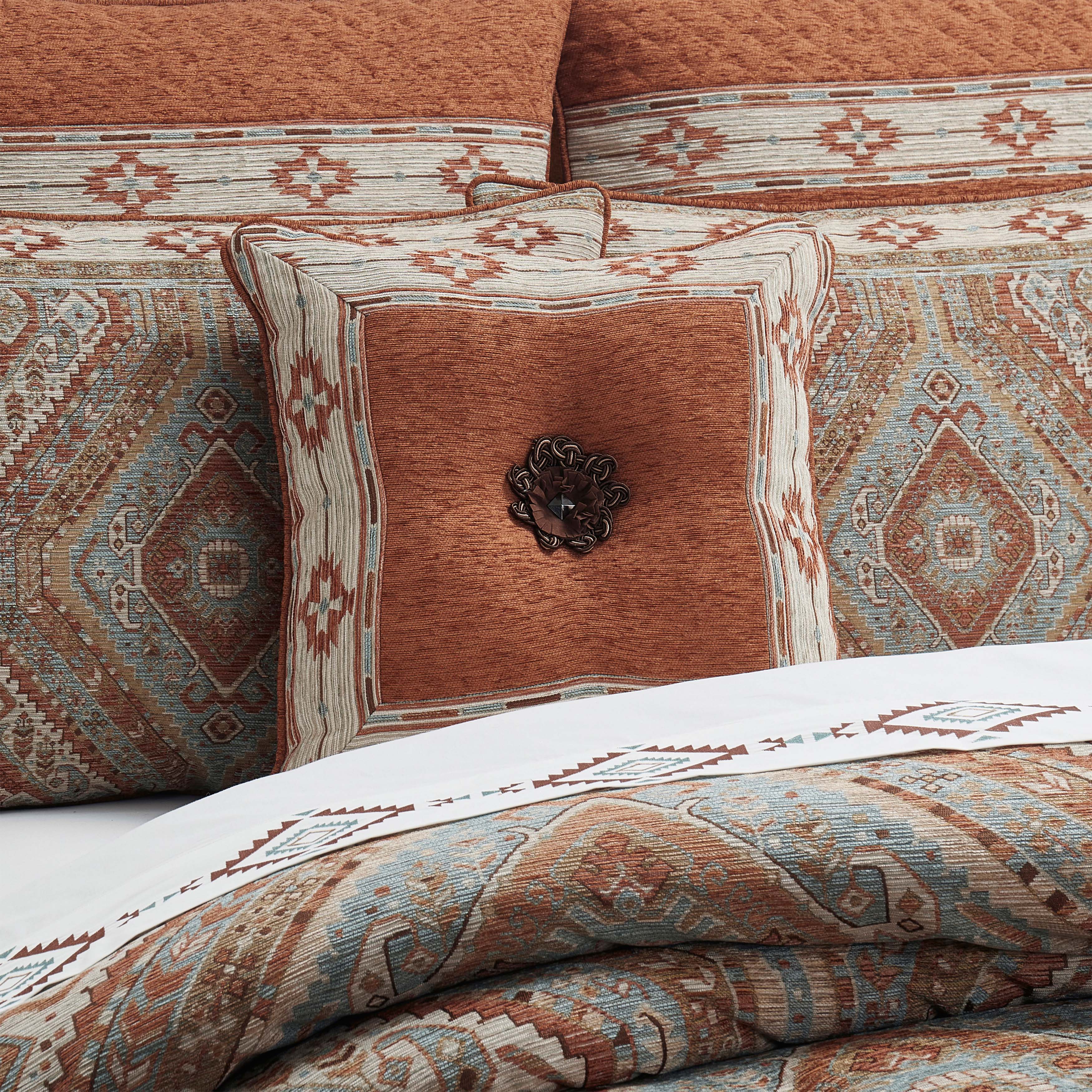The jackson lodge 18 inch pillow is framed with a southwest regional embroidered detail in a clay color with hints of turquoise and natural hues. The hand-made embellished iron button and knots adds a luxurious unique charm. Pair this pillow with the jackson lodge bedding and window treatments to complete the ensemble.
