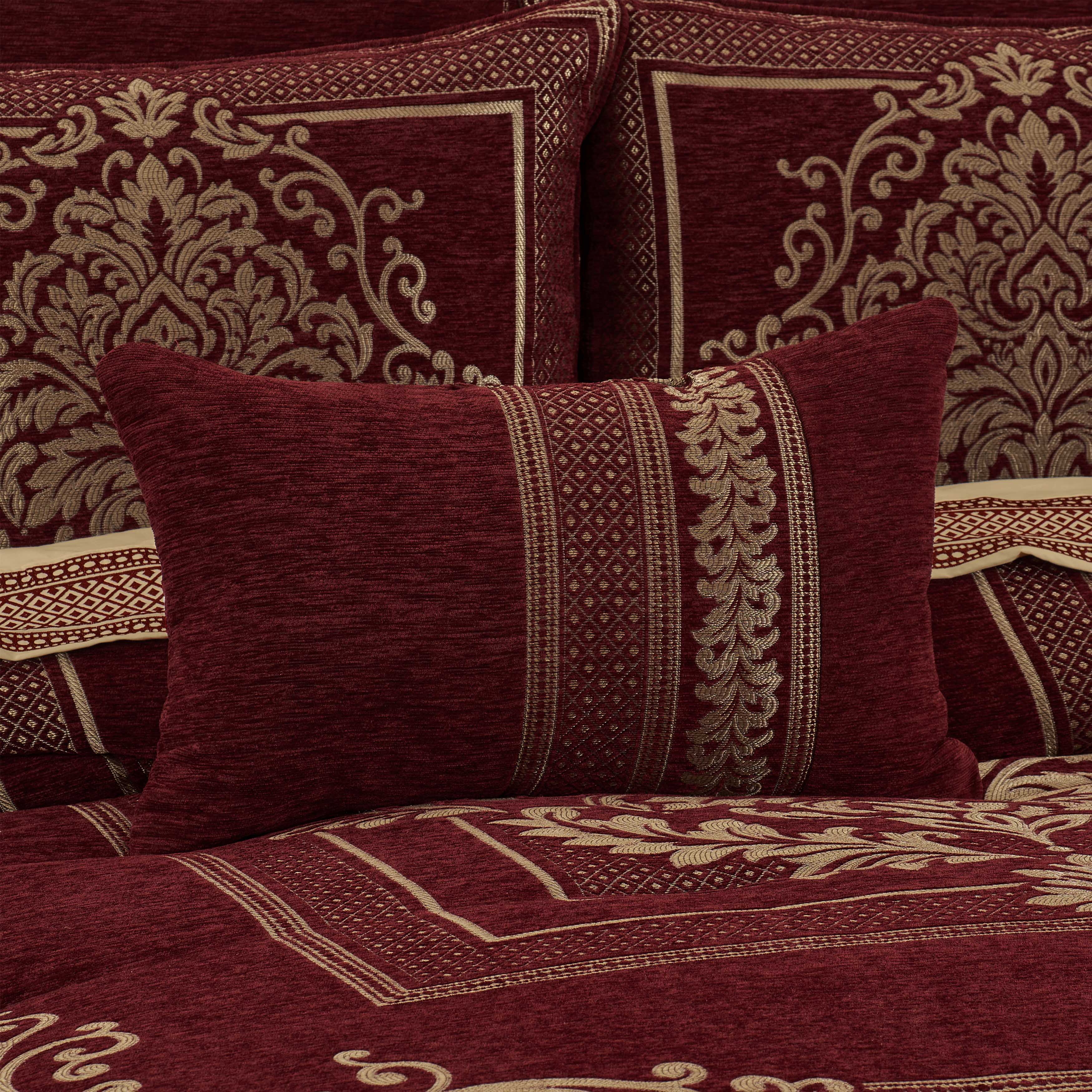The laurenza boudoir pillow is intricately designed with a woven stripe in a crimson red color. The boudoir reverses to a coordinating plush chenille fabric and coordinates beautifully with the laurenza bedding collection.