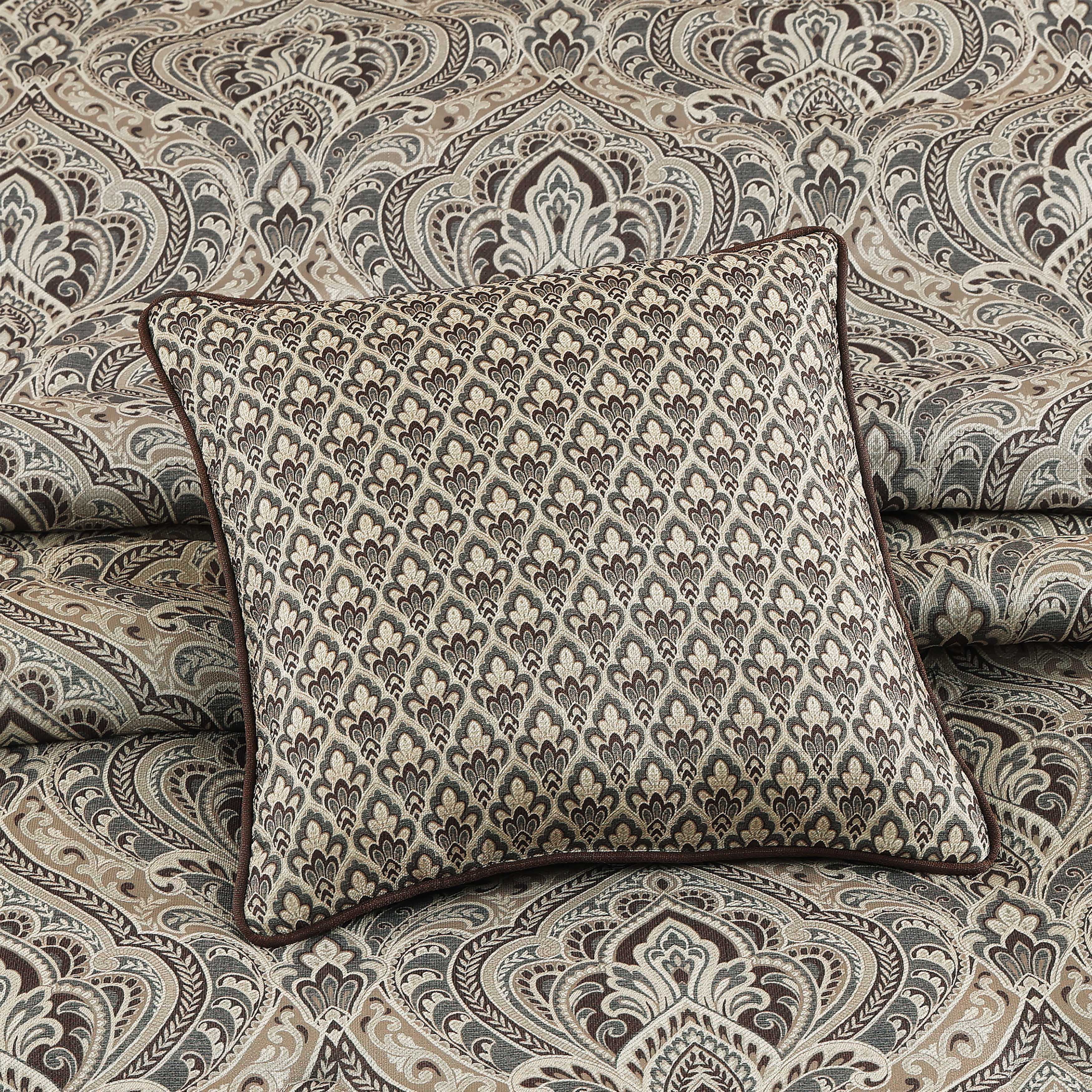 The maren 16 inch pillow features a grand-scale damask pattern in various shades of light and antique gold, beige, and chocolate. The fabric has a soft slub texture and it reverses to a solid brown fabric, allowing you to change your looks. Pair this pillow with the maren bedding and window treatments to complete the ensemble.