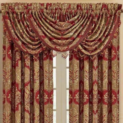 Maribella is a large woven chenille damask in rich tones of red and taupe combined with hues of gold. The oversized comforter is embellished with solid red velvet piping.