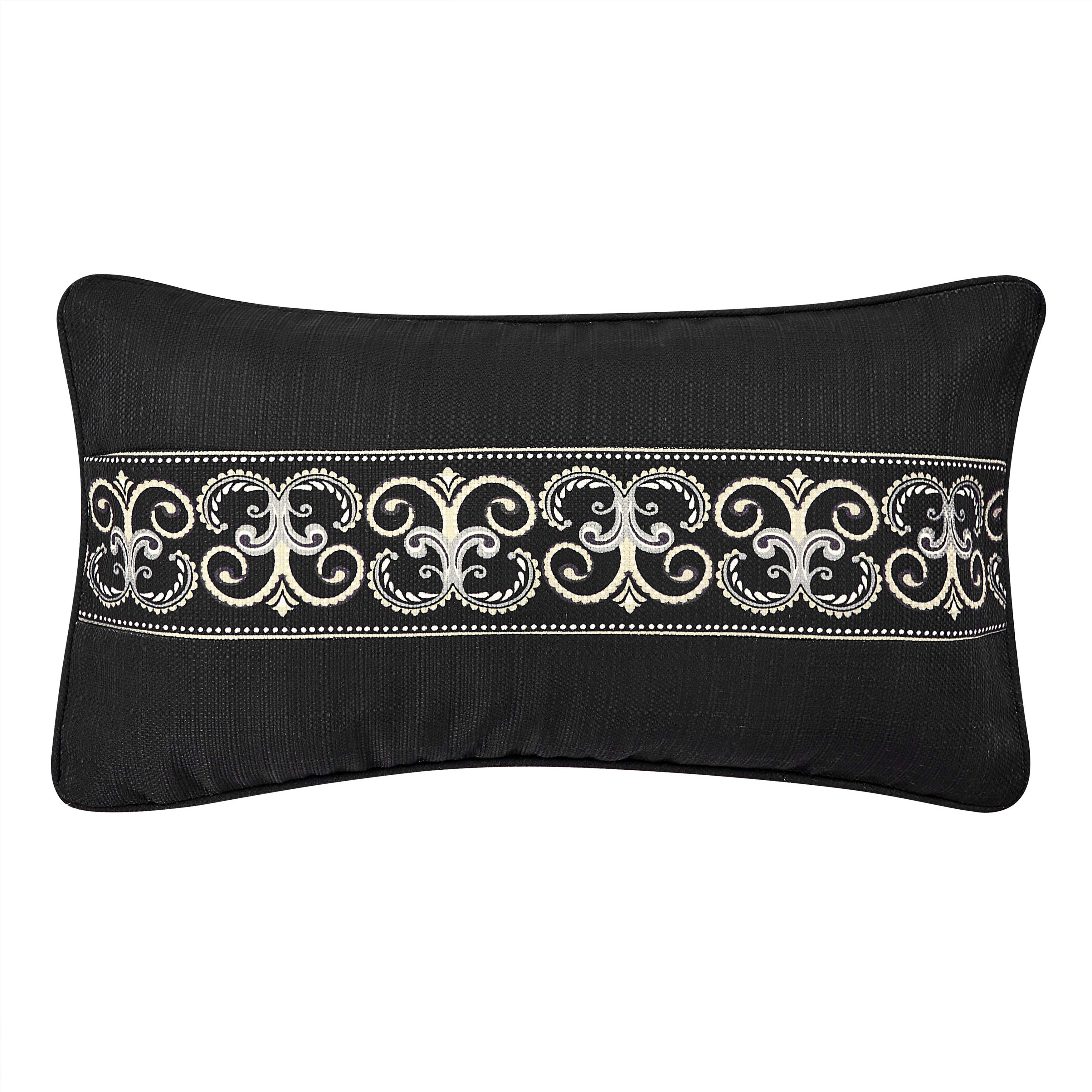 The messina boudoir throw pillow features an intricate medallion design in silver and black tones paired with a plush texture fabric. The reverse is a solid black fabric, adding a layer of beauty and simplicity. Pair this luxe accent pillow with the messina comforter set for a complete elegant look.