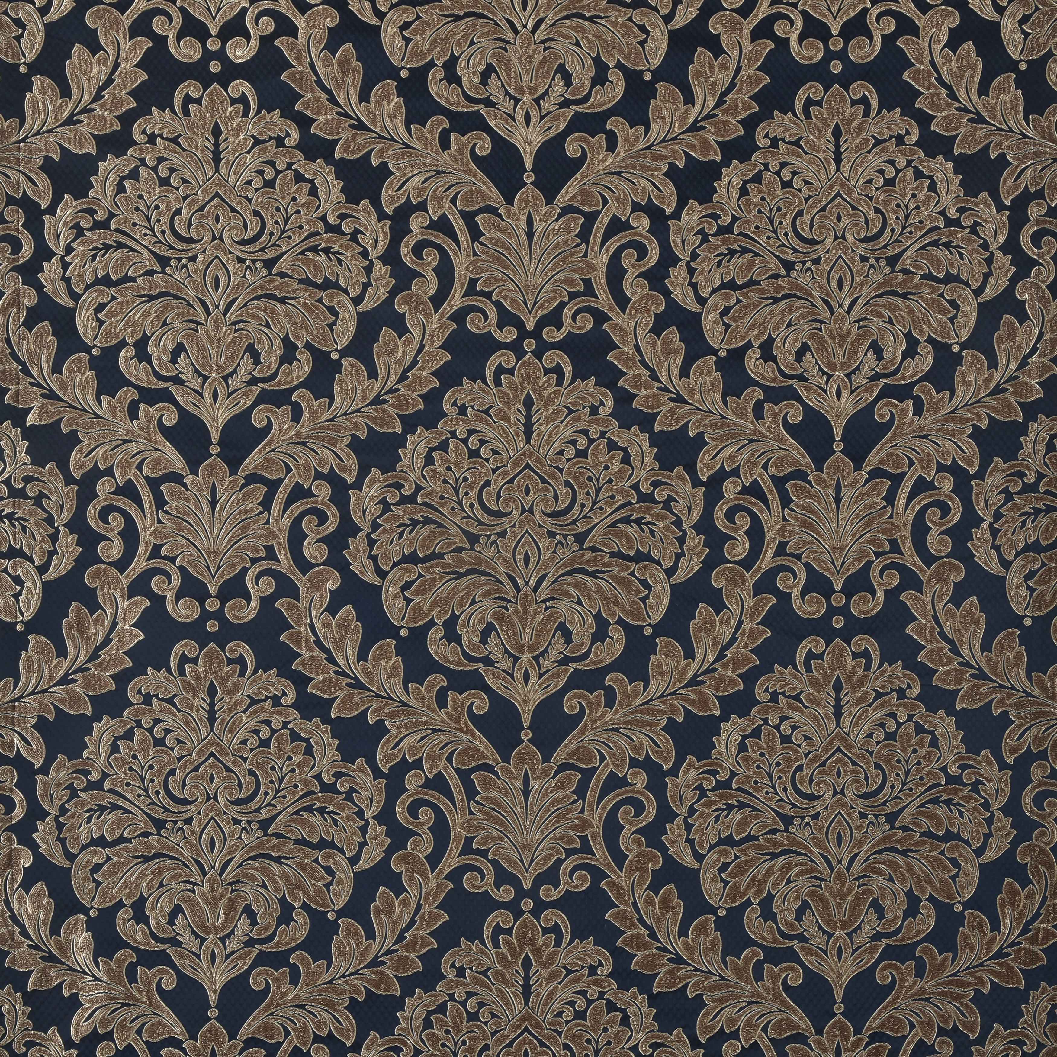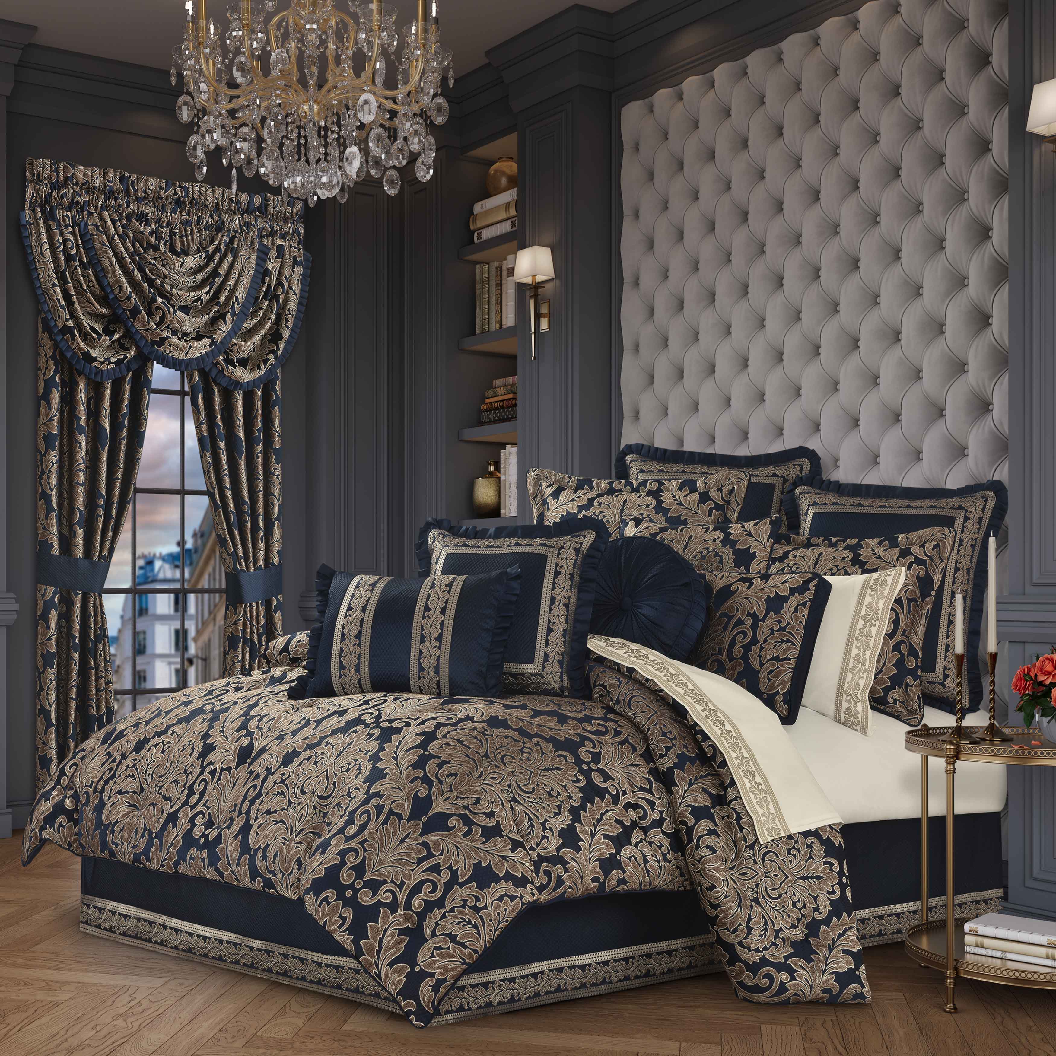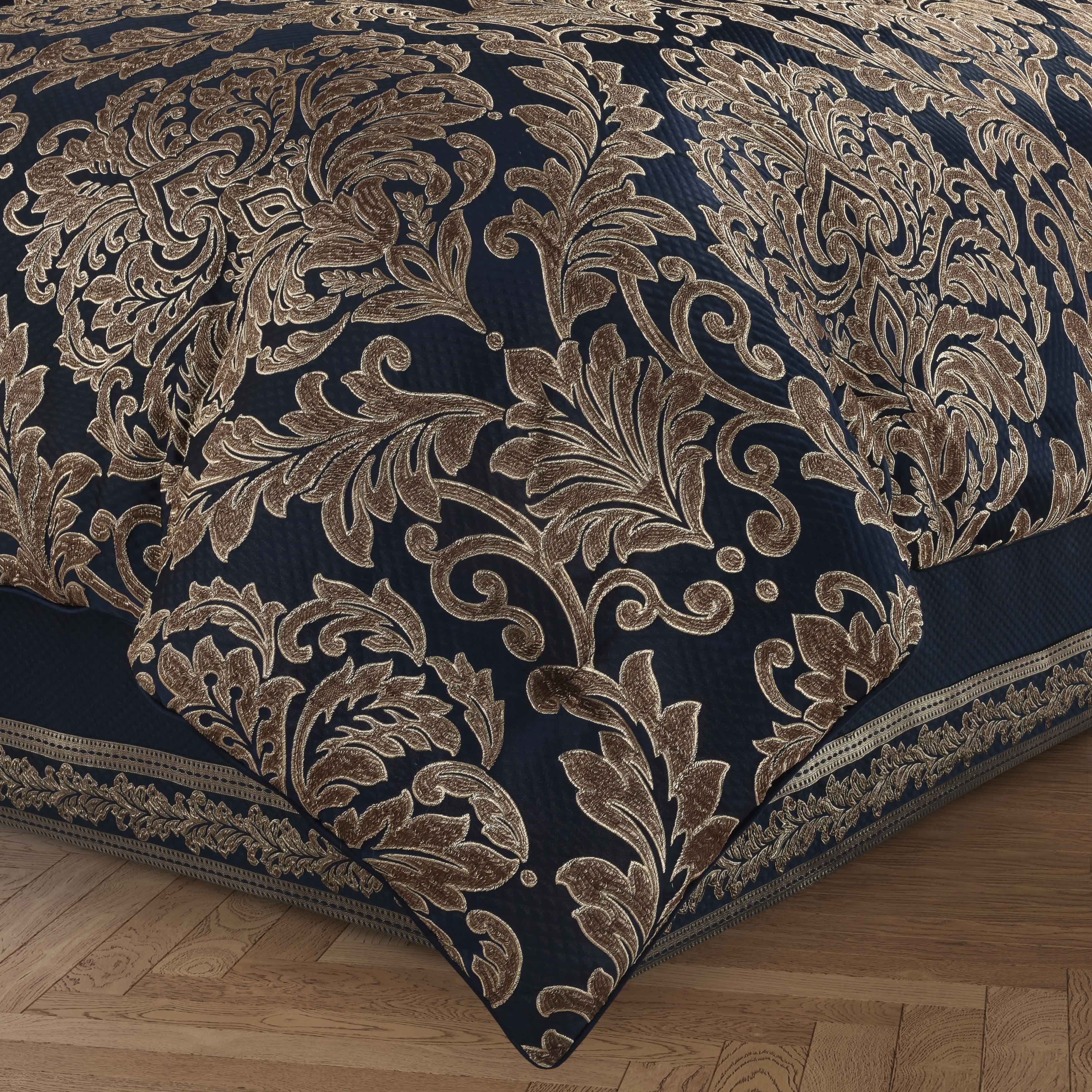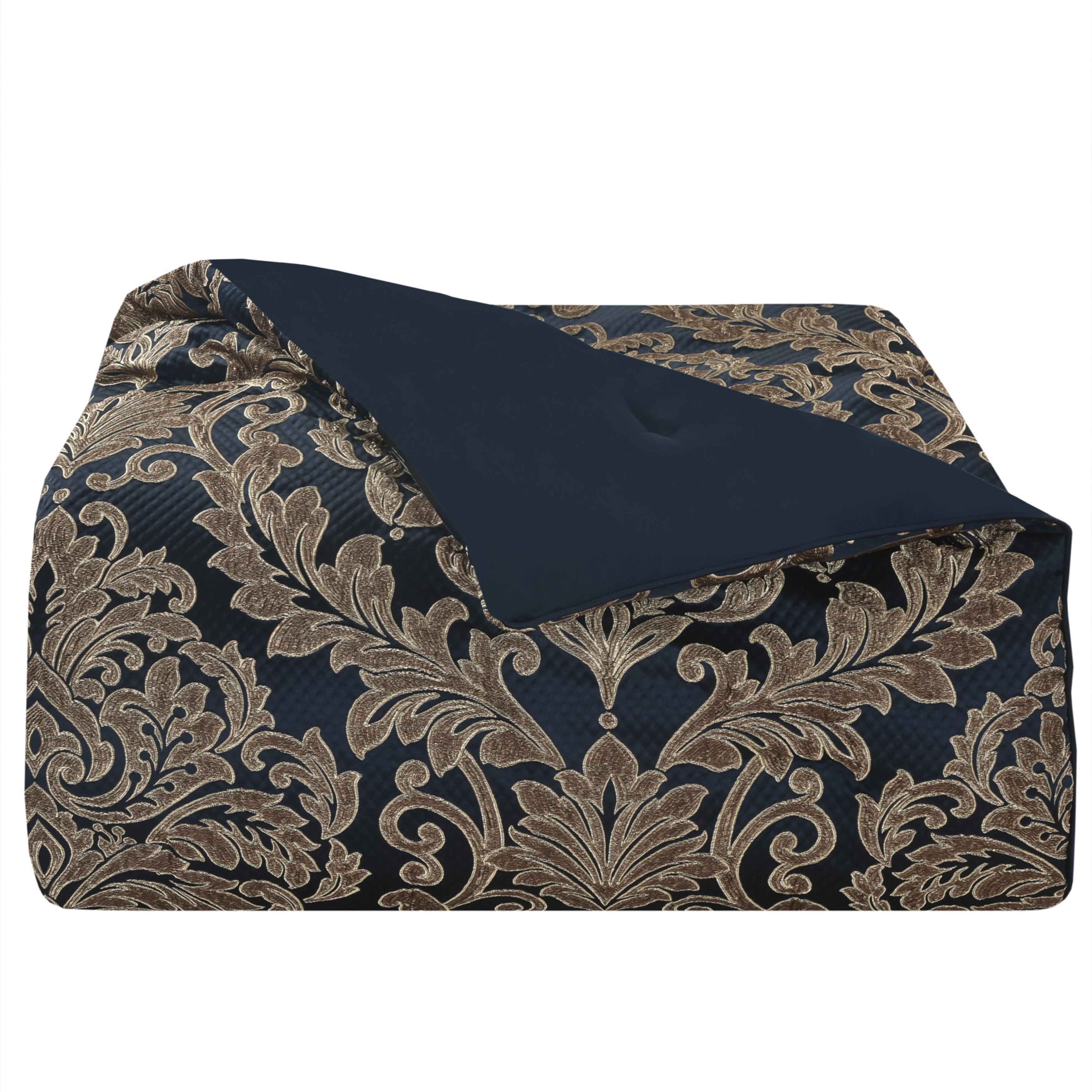 Grand-scaled european elegance is executed within every detail of the monte carlo 4 piece comforter set. A dramatic deep navy blue satin matelasse is paired with a classic damask pattern, which incorporates a unique weave technique giving the appearance of antique polished metals in bronze tones, outlined by golden yarns. A small satin piping finishes the lofty and oversized comforter that reverses to a plush solid fabric. Two padded pillow shams featuring a coordinate grand damask and a split-corner bedskirt with an elegant border along the bottom edge beautifully complete the set. Pair this bedding collection with the monte carlo throw pillows, euros, and window treatments to add luxury and opulence to your bedroom.