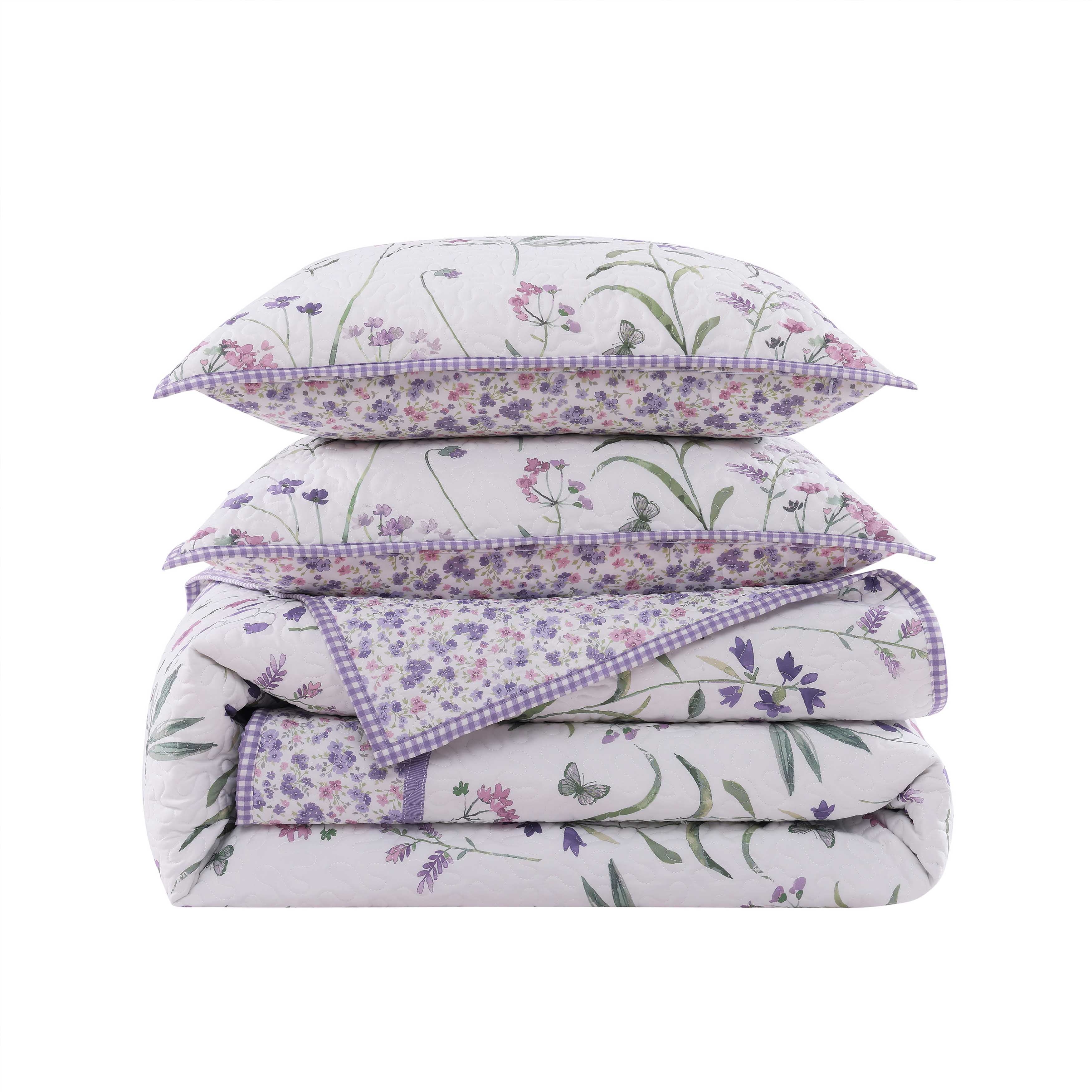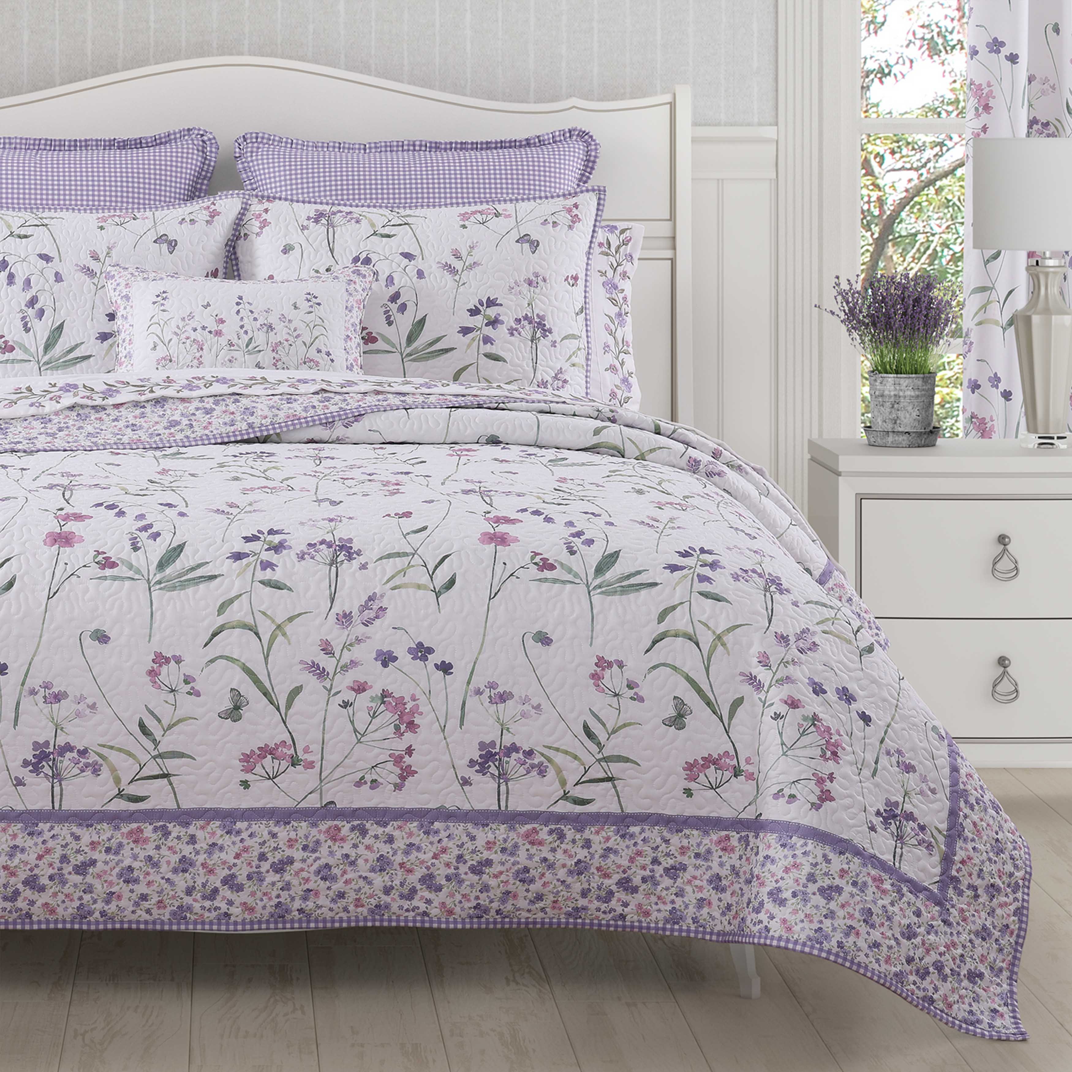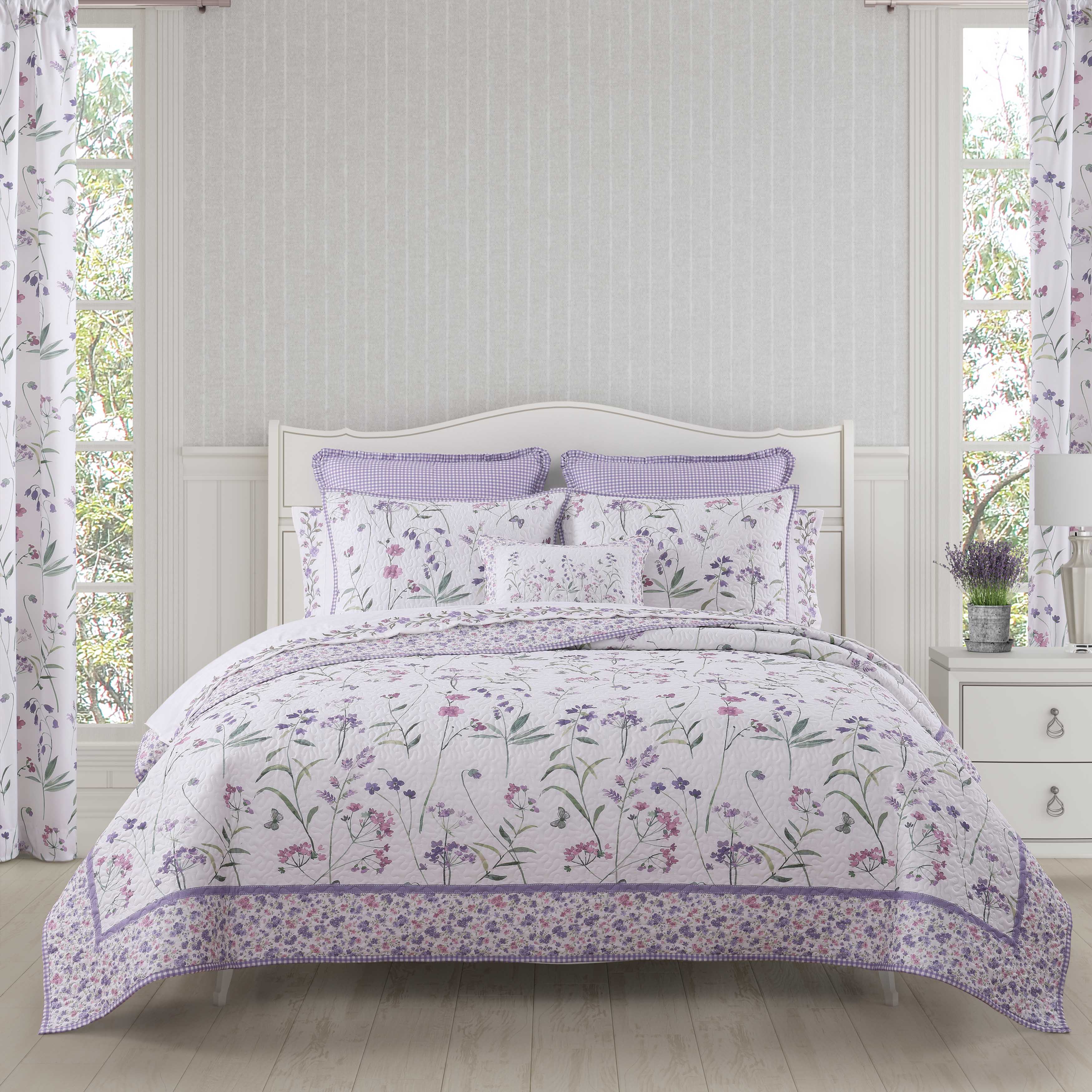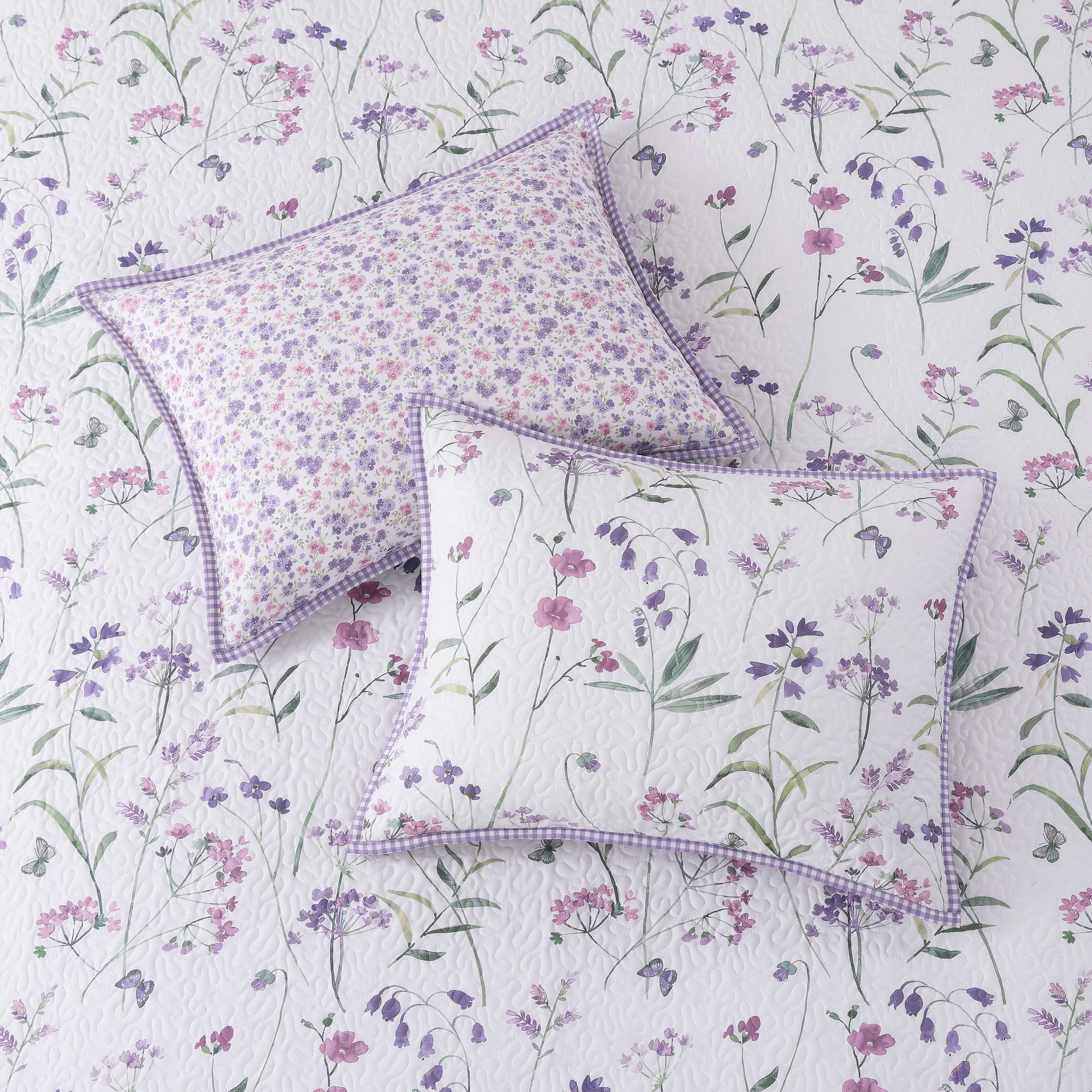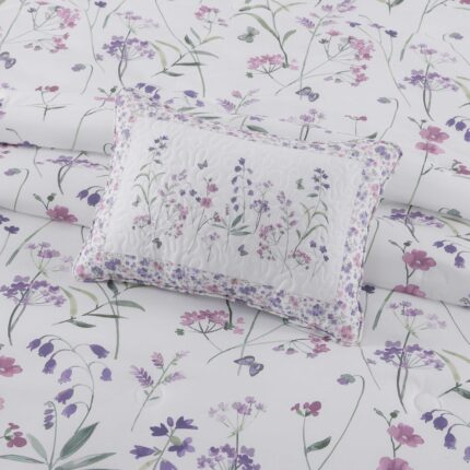 The nola quilt set features a whimsical engineered floral design, that is framed with a small ditsy floral border and ribbon detail in beautiful shades of lavender and lilac on a white backdrop. The included coordinate floral pillow shams and ditsy floral reverse throughout the ensemble make this set a charming yet chic addition to your decor. Add the handcrafted pillows and charming window treatments to complete this inviting design.