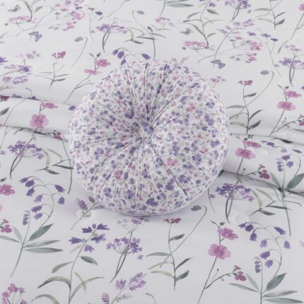 features a whimsical engineered floral design, that is framed with a small ditsy floral border and ribbon detail in beautiful shades of lavender and lilac on a white backdrop