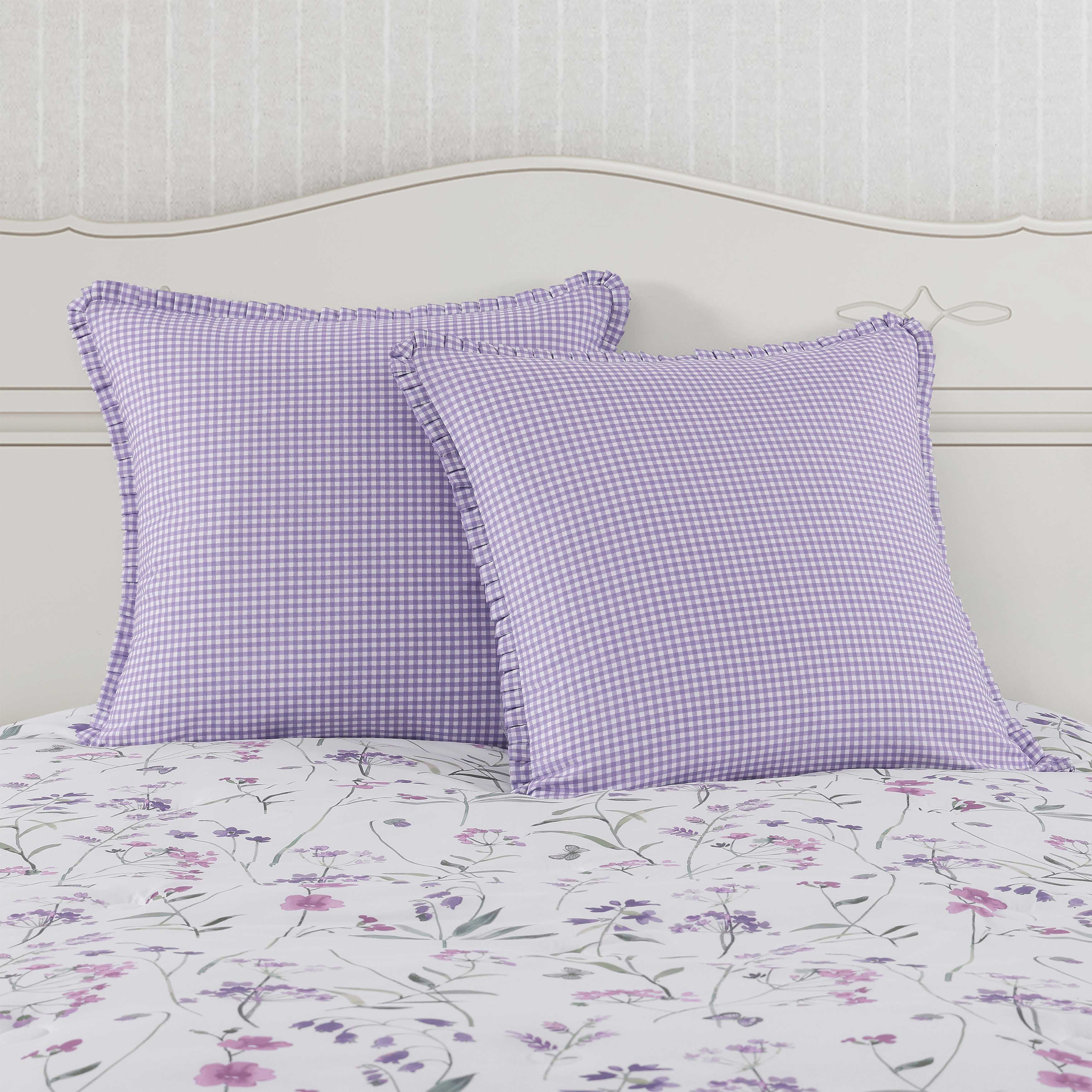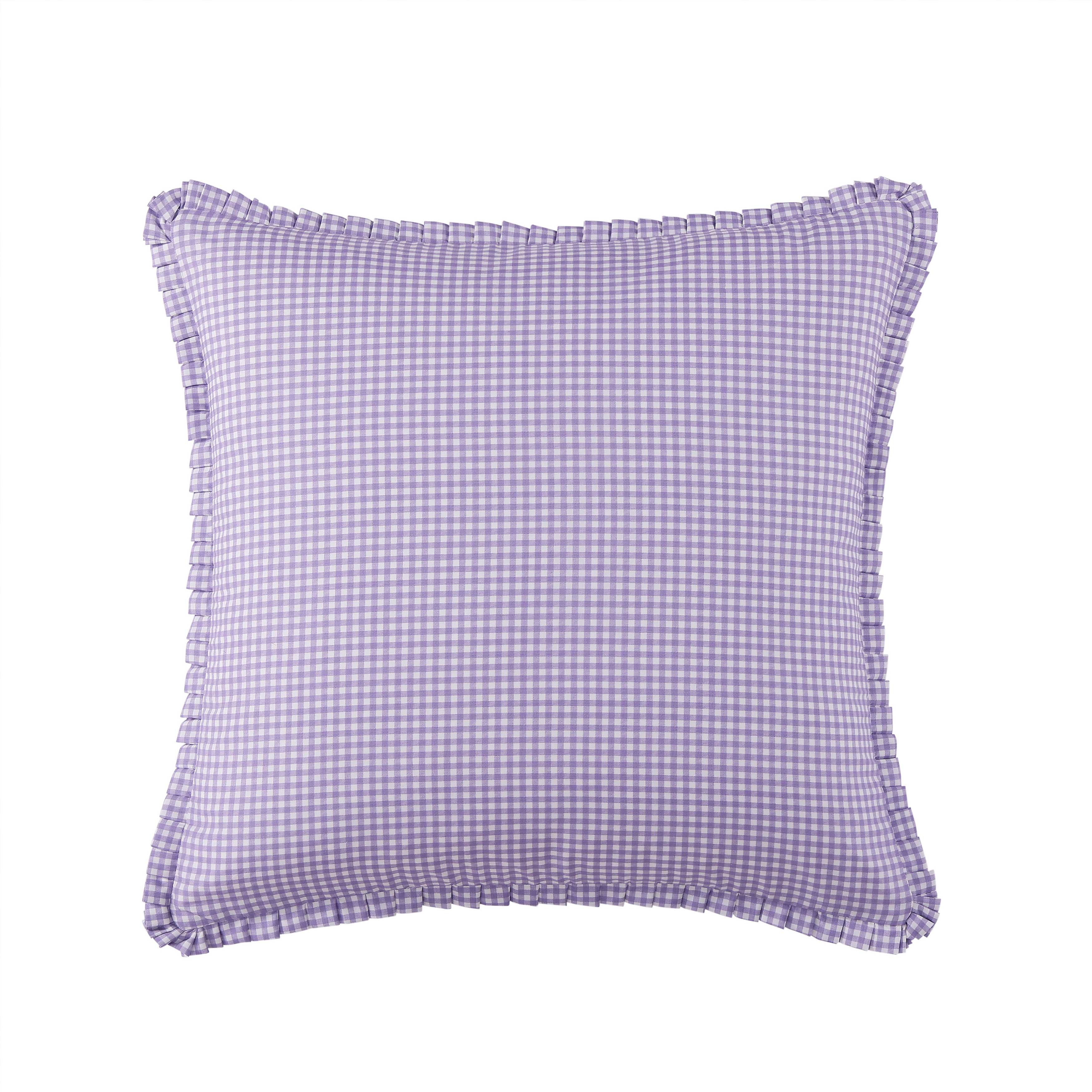 The nola euro sham is crafted with a white and lavender gingham check pattern that coordinates back to the bed set. It is finished with a hidden zipper closure and pleated flange to add a charming finishing touch to the nola bedding collection.