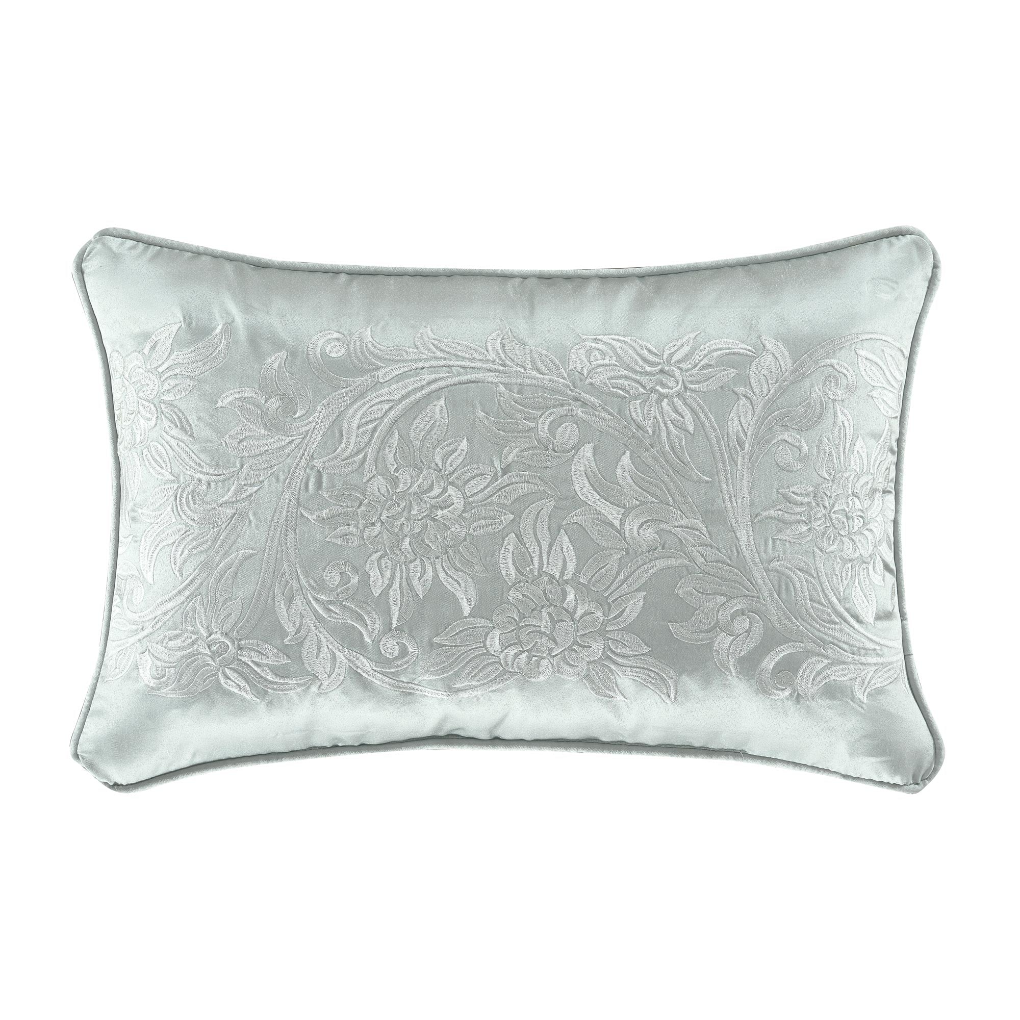 The Riverside Boudoir Throw Pillow Is Beautifully Pieced With A Centered Woven Floral Scroll In Spa Blue With Spa Piping For Added Detail. Pair This Accent Pillow With The Riverside Bedding For A Complete Elegant Look.