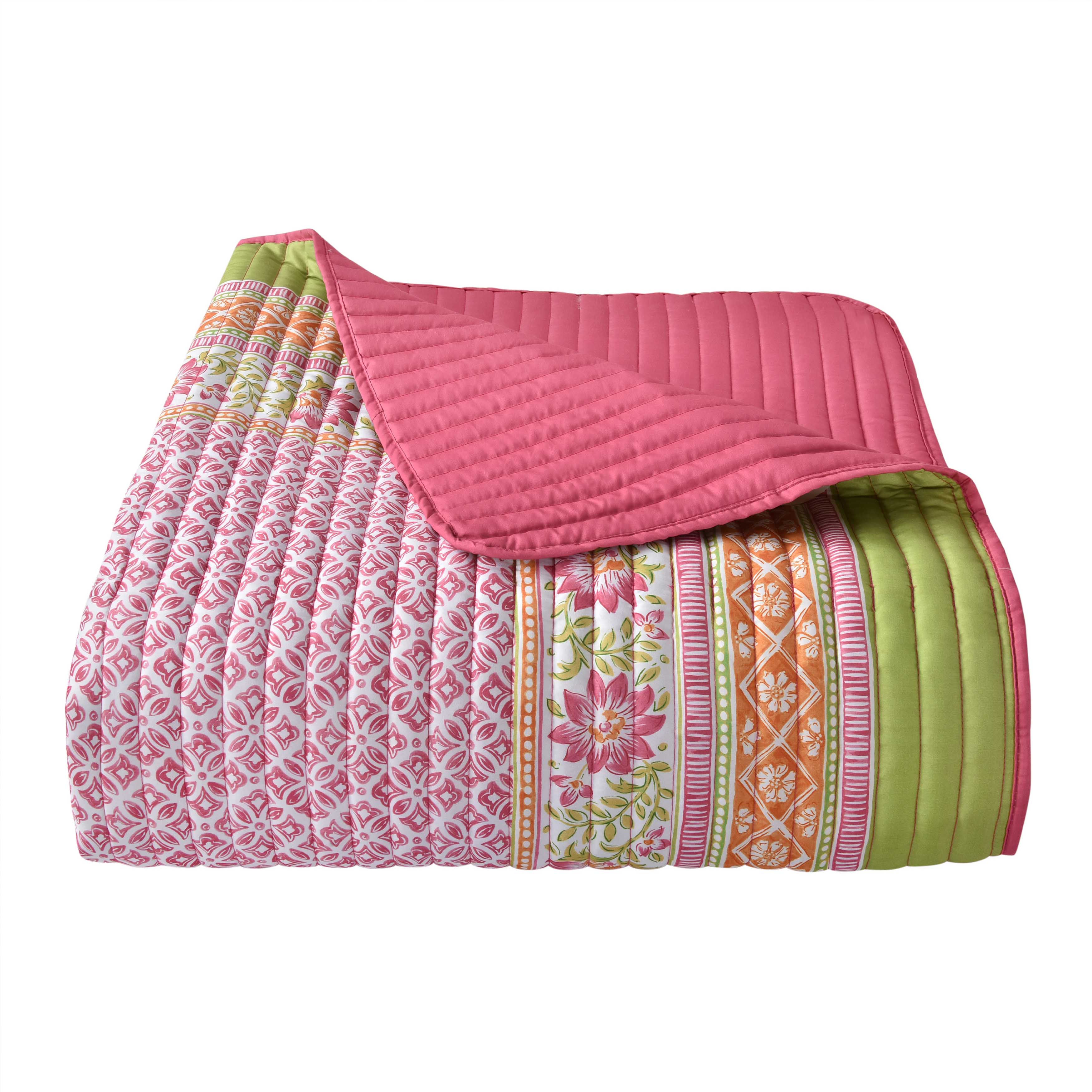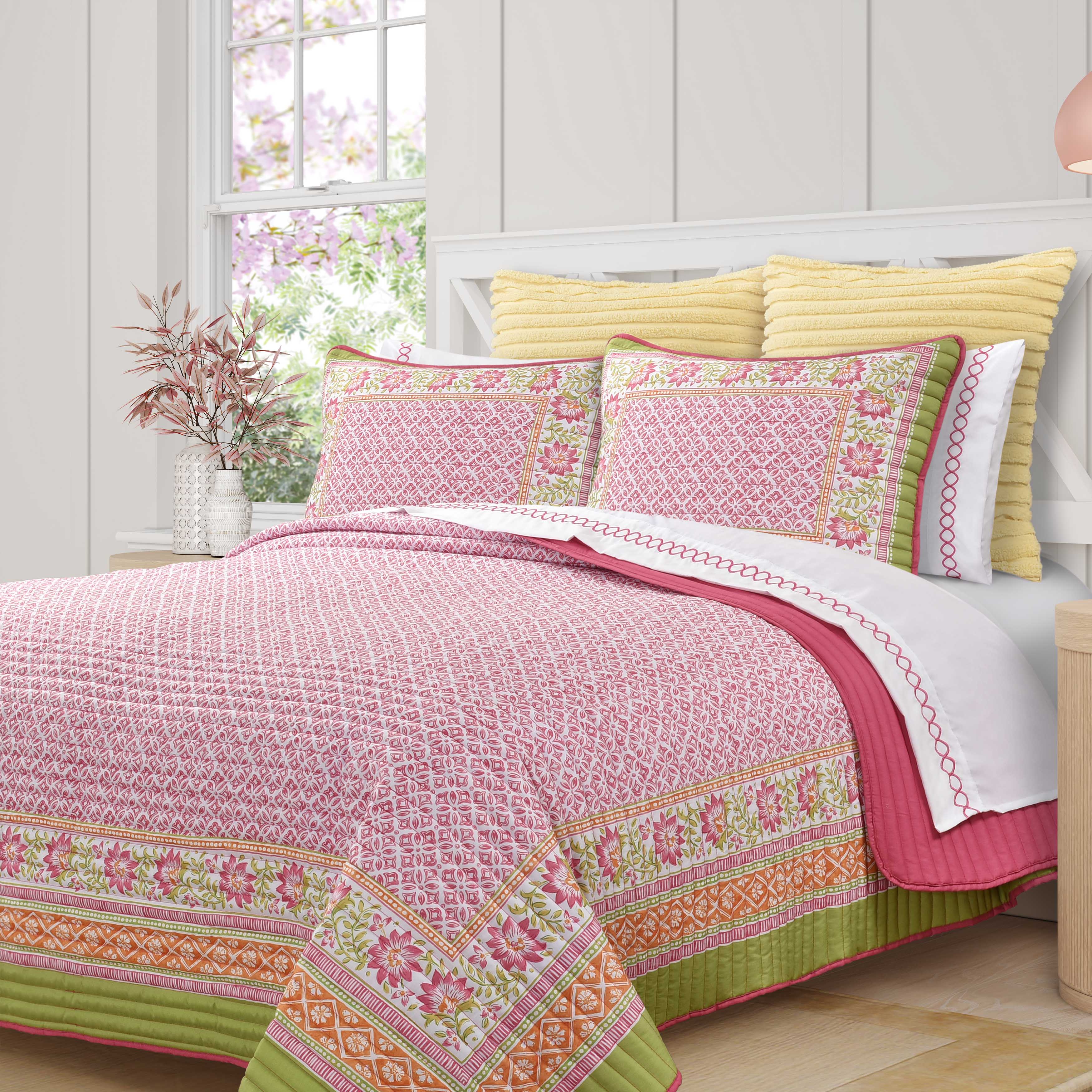 Featuring a delightful floral and geometric print, this lightweight 3-piece quilt set brings a cheerful and refreshing vibe to your space. Constructed from soft and durable microfiber and quilted with a 1€� stripe pattern, this design showcases vibrant pinks, greens, and oranges, making it a standout piece in any room. The shiloh quilt set includes one quilt and two shams (one sham for twin size), ensuring your bedroom feels like a reflection of your bold style every night.