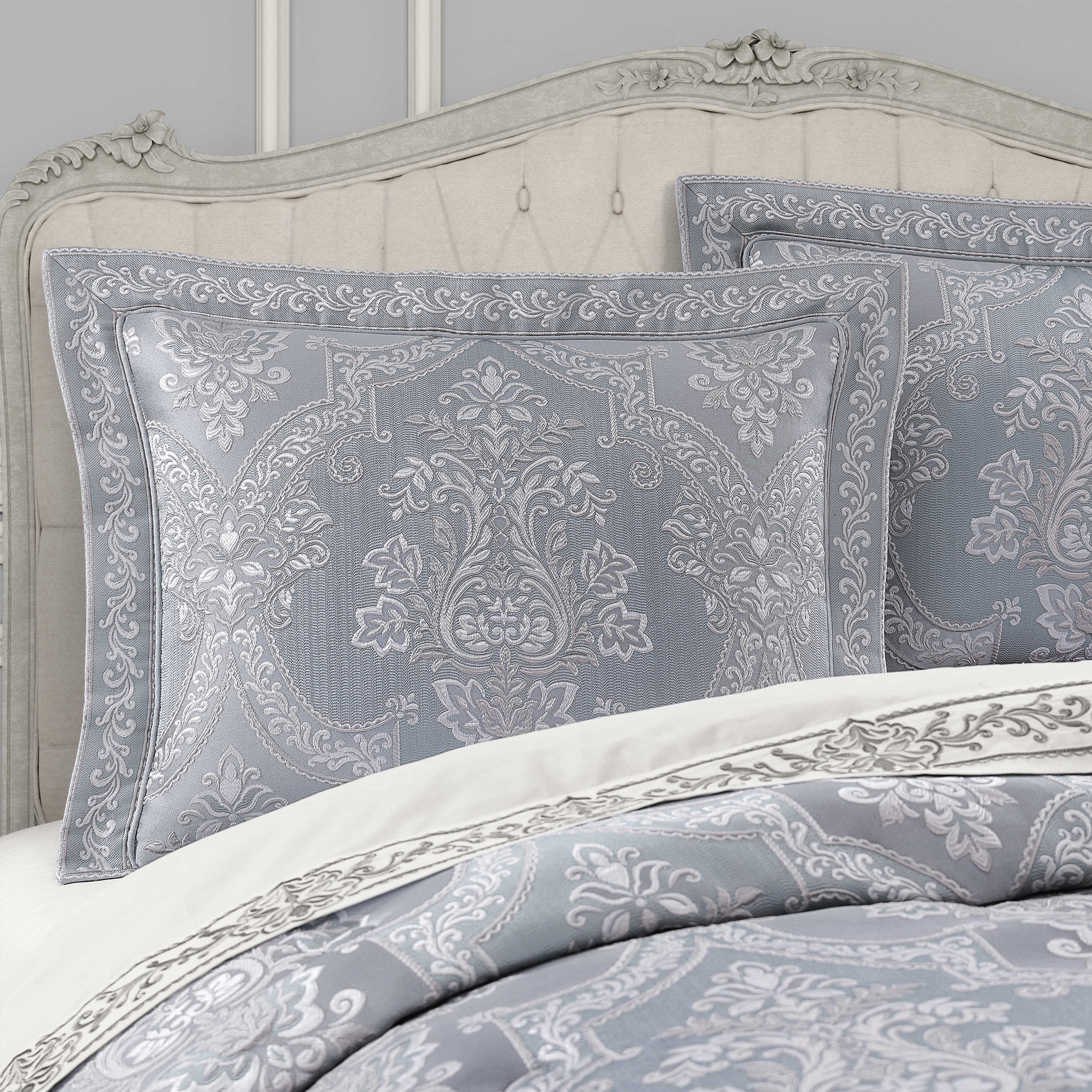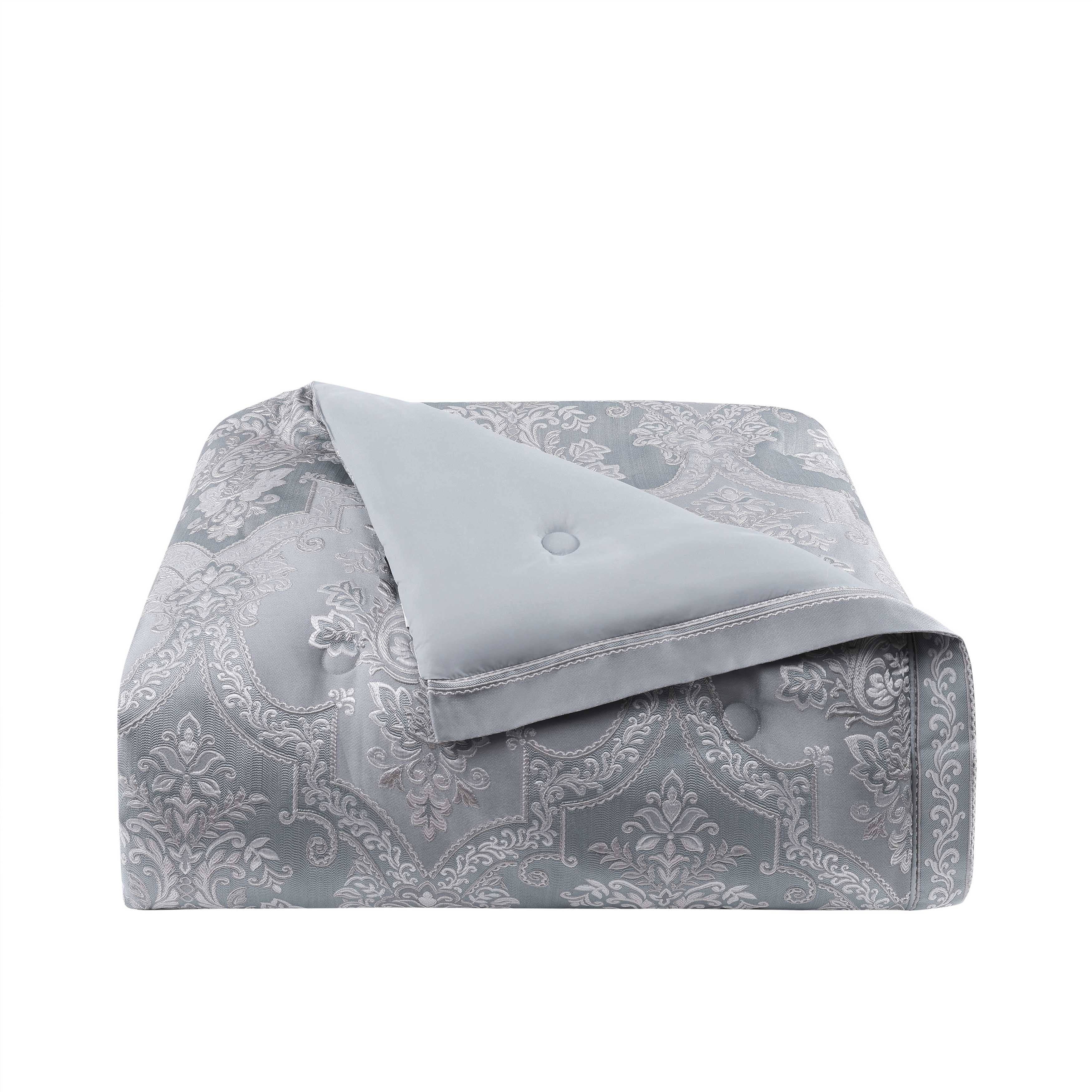The sondra comforter set features a stunning traditional woven damask paired with an intricately designed herringbone weave. The soft powder blue tones in this bedding ensemble are a great accent to any bedroom. The comforter is generously oversized and overfilled and finished with solid piping. Also included are 2 coordinate pillow shams, with a tailored bedskirt which adds the finishing touch. Add the sondra accessories and window treatments to complete the look.