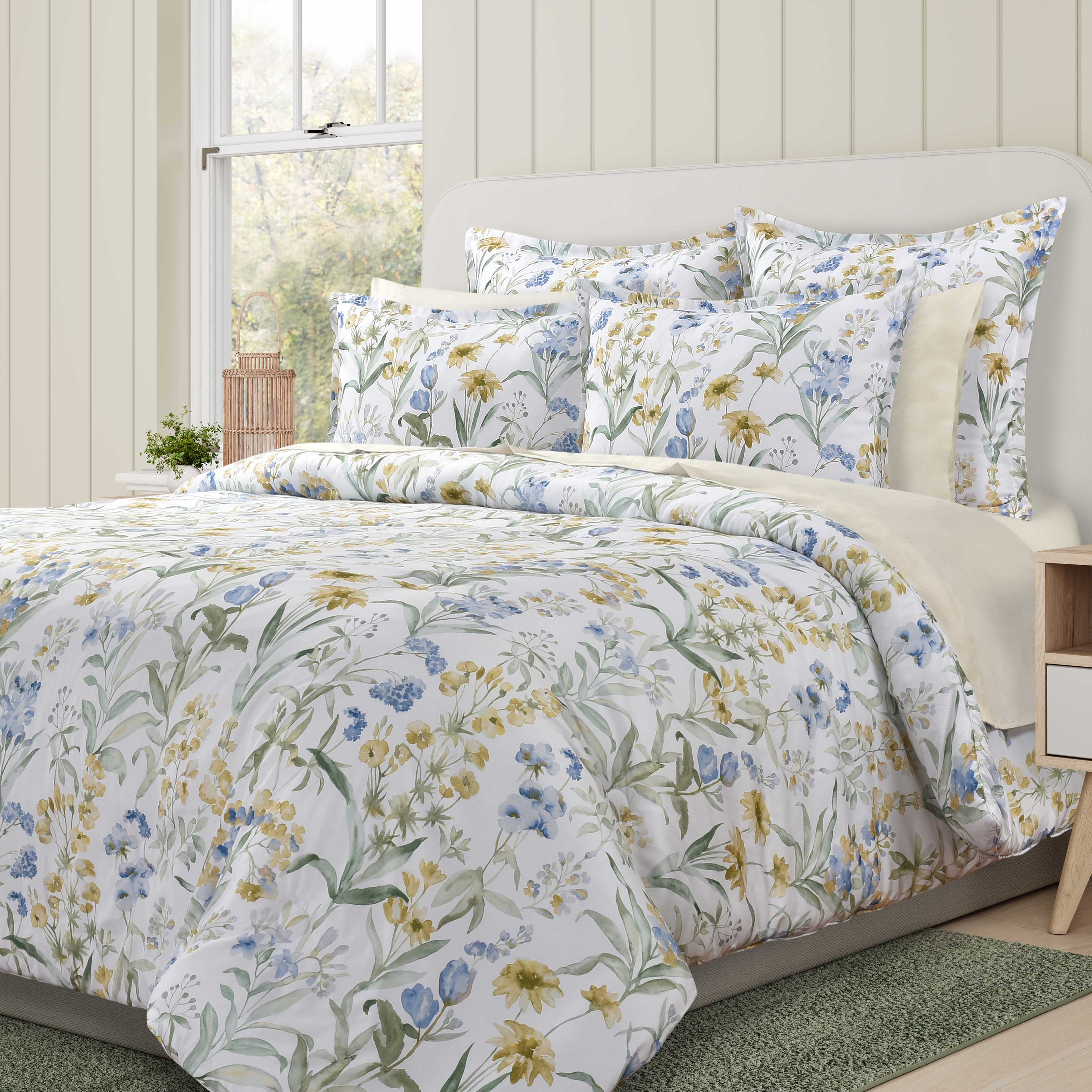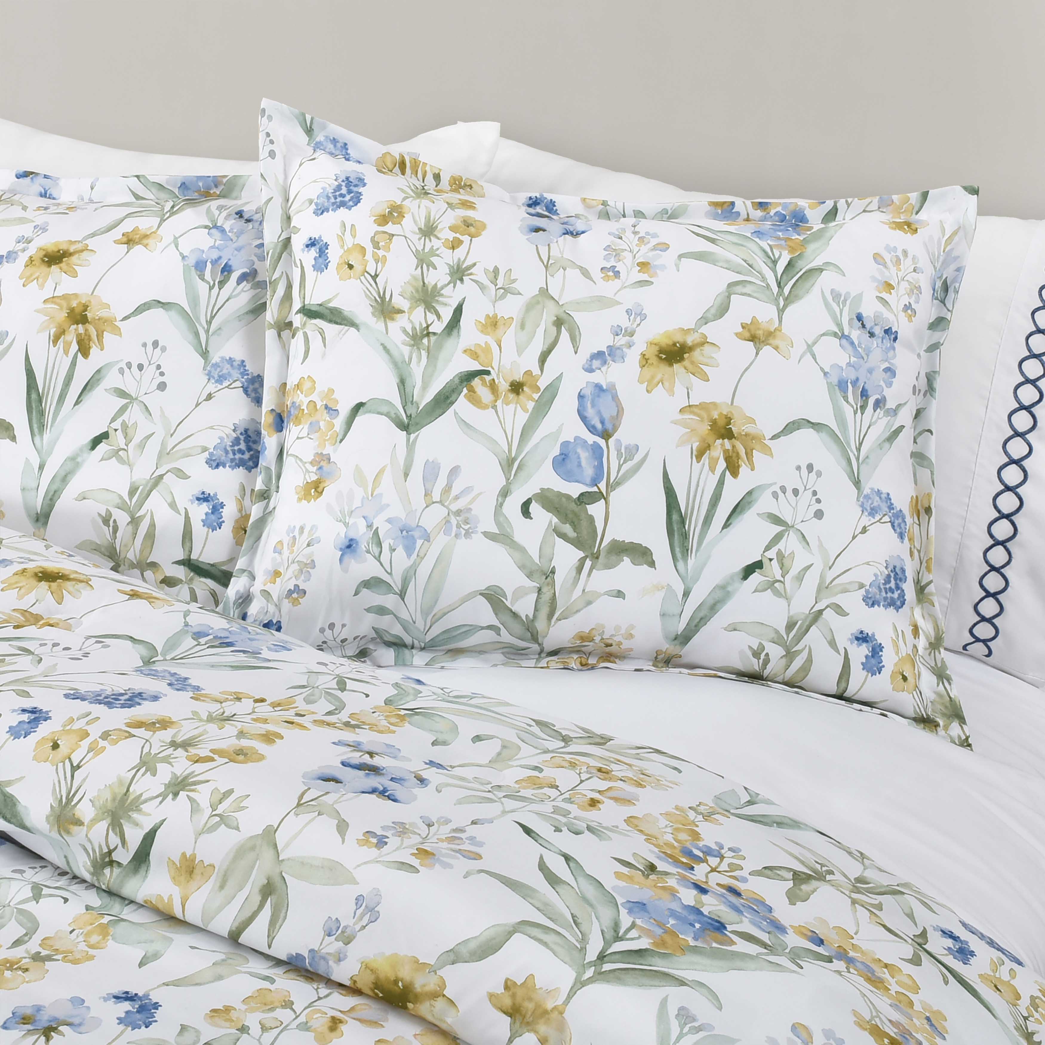 Elevate your bedroom decor with the tallulah comforter set, a perfect blend of elegance and charm. The comforter features a beautiful, delicate floral pattern in shades of blue, yellow, and green, bringing a garden-like ambiance to your sleep space. Crafted from luxurious, breathable microfiber fabric, this lightweight yet cozy comforter ensures both comfort and durability, making it ideal for year-round use. The set includes a comforter and two matching pillow shams (one for twin size), all designed to provide a soft, inviting feel while adding a sophisticated touch to your room. Perfect for creating a serene and stylish retreat.