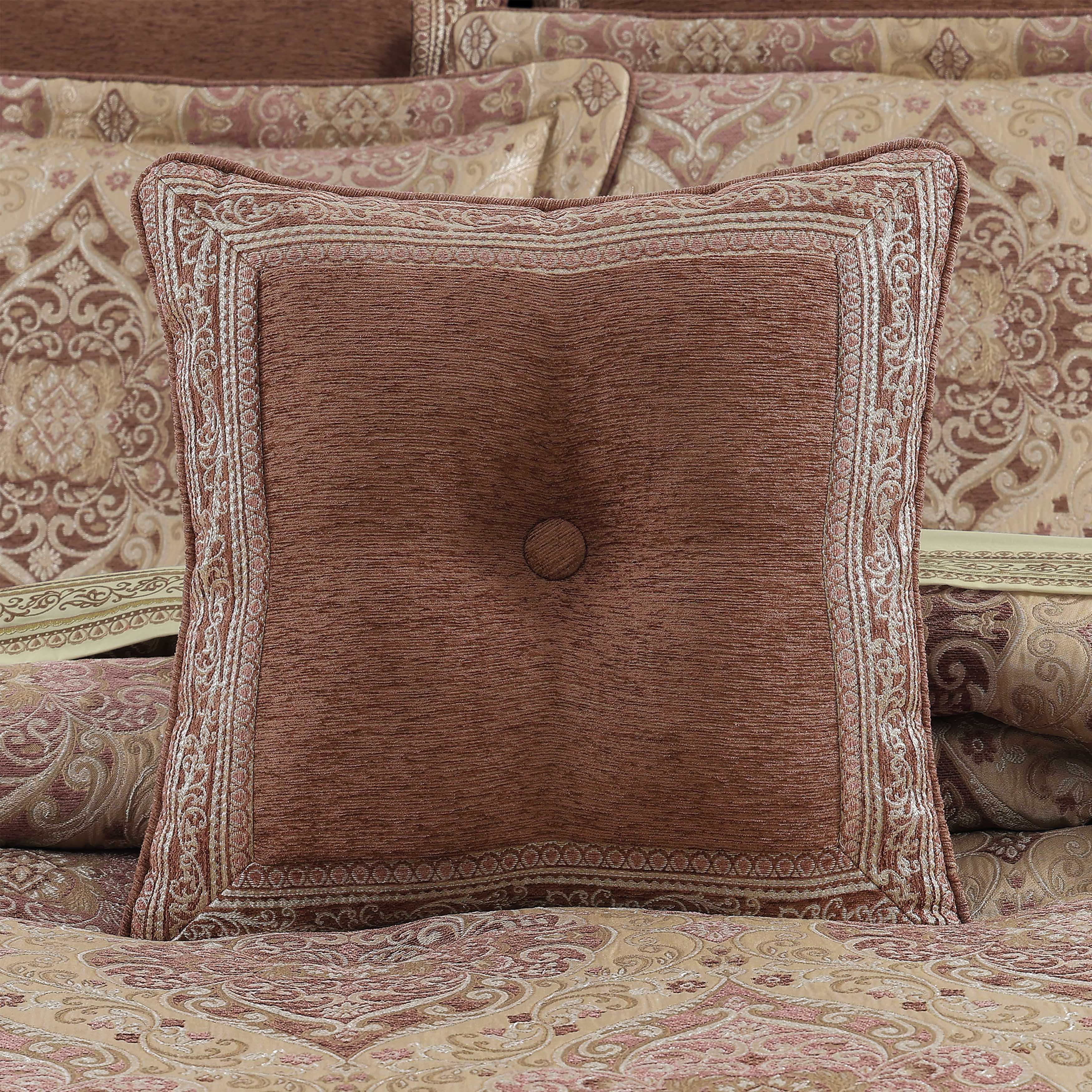 Inspired by european elegance, the weston 18″ decorative throw pillow features a classic damask border pattern in a lovely terracotta colorway. A tufted button with dyed to match self-fabric piping finishes the lofty throw pillow. This luxurious accent pillow is recommended to add as the finishing touch to the weston bedding set.