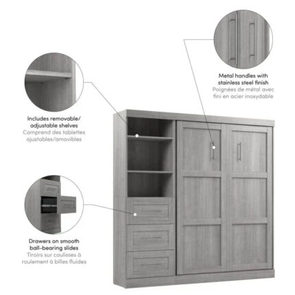 Bestar Pur Full Murphy Bed and Shelving Unit with Drawers (84W) in Platinum Gray